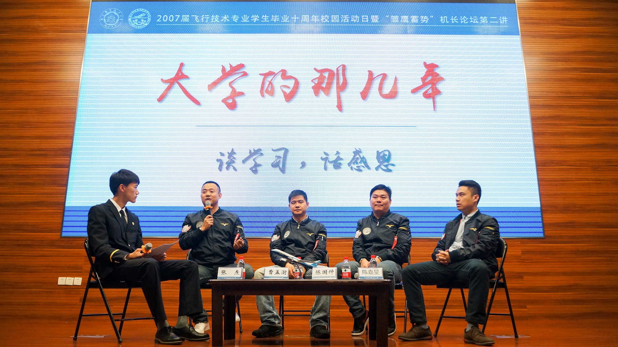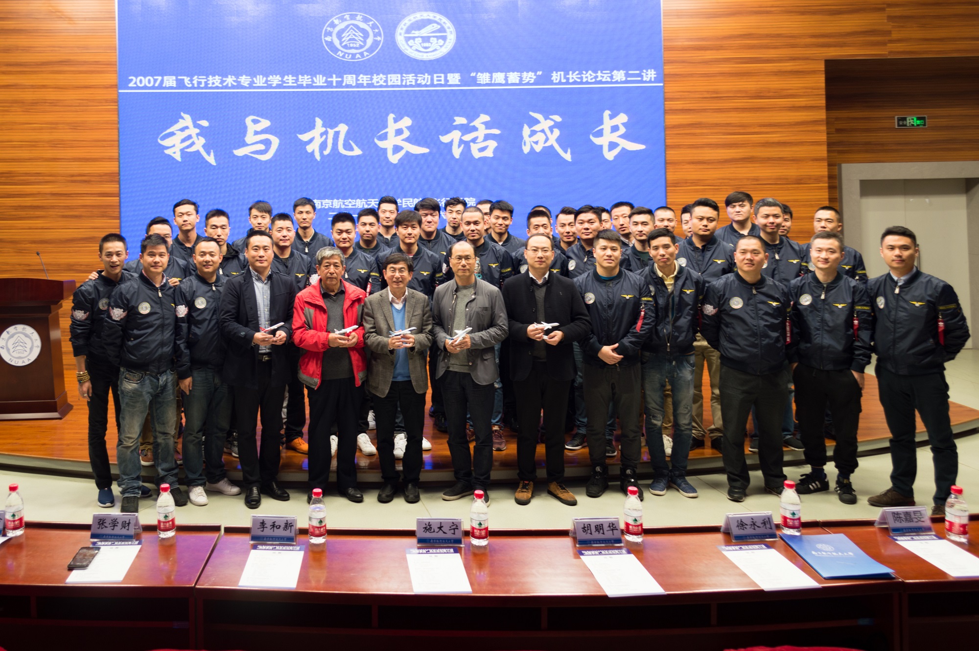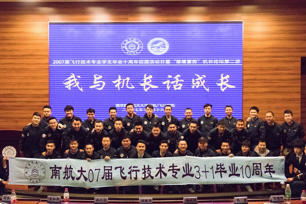 2017年11月16日,2007届飞行技术专业“3+1”学生毕业十周年校园活动日暨“雏鹰蓄势”机长论坛第二讲在将军路校区顺利举行。40名南航大毕业的优秀机长代表怀着激动的心情回到母校,担任本期机长论坛的开讲嘉宾,为学生现场教学开飞机的知识。副校长施大宁教授、民航/飞行学院院长胡明华、发展联络部徐永利、成人动漫 党委副书记李和新以及民航/飞行学院师生代表400余人参加了本次活动。