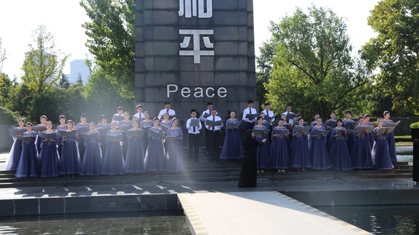 参观结束后,同学们在和平广场手工折叠象征和平的“紫金草”,表达对世界和平、民族振兴的美好愿景。随后,成人动漫 学生合唱团带来歌曲《我爱祖国的蓝天》,“紫金草”合唱团现场演唱《让世界充满和平》、《和平颂》两首歌曲。活动的最后,全体师生共同唱响《让世界充满爱》,将现场气氛推到高潮。