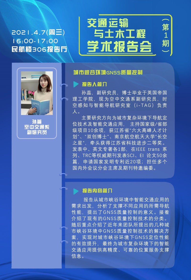 孙蕊,副研究员,博士毕业于英国帝国理工学院,现为空中交通系副研究员,时空感知与智能导航研究室(i-TAG)负责人,主要研究方向为城市复杂环境下导航定位技术及智能交通应用,主持国家级/省部级项目10余项,获江苏省“六大高峰人才计划”、“双创博士”、成人动漫 “长空之星”,牵头获得江苏省科技进步二等奖。发表中、英文专著各1部,在IEEE trans 系列、TRC等权威期刊发表SCI、EI 论文50余篇,申请国家发明专利近20项;担任多个国内外会议分会主席及期刊特邀编委。