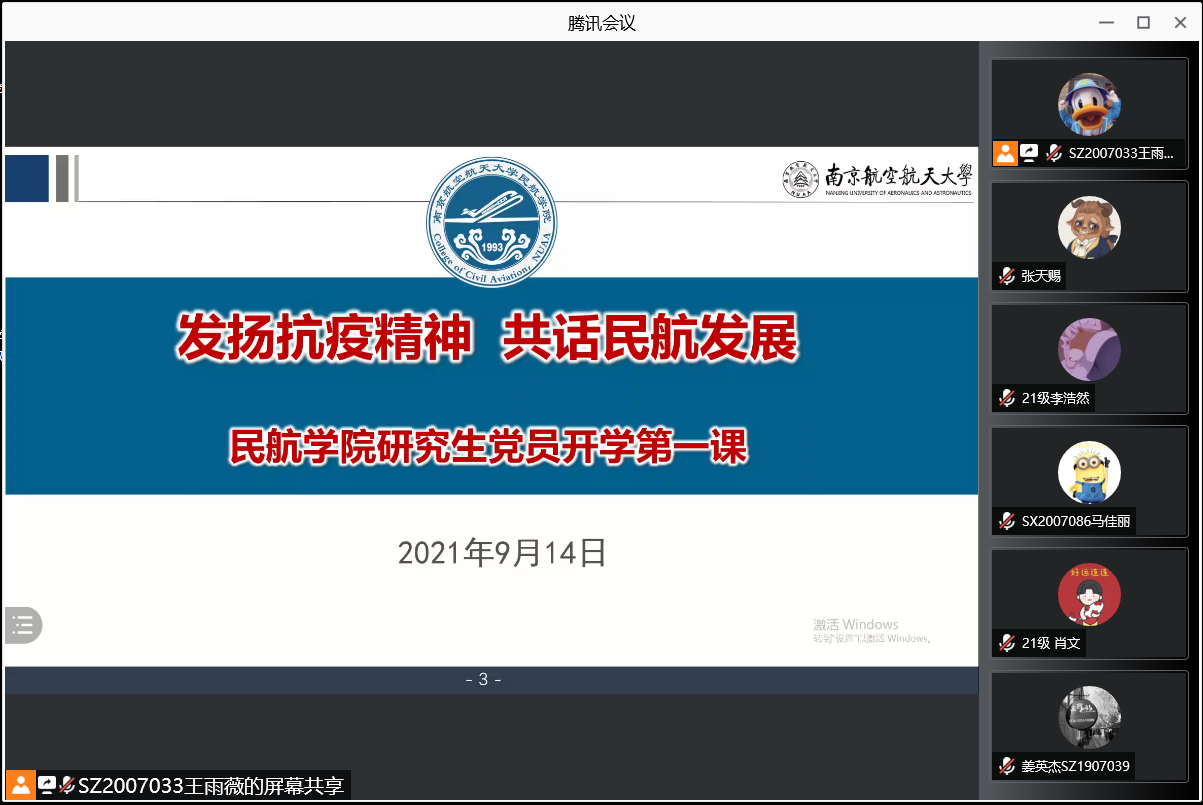 为传达学校疫情防控工作及相关要求,加强新老生的交流互动,同时帮助21级研究生新生形成对学院的认同感、归属感,尽快找准目标定位,走好“研途”,9月14日,成人动漫 党委书记刘建成为研究生党员作了题为《发扬抗疫精神 共话民航发展》的党课暨“开学第一课”。会议以线上形式召开,组织员侯美丽、组宣干事童肖、研究生辅导员及全体研究生党员和入党积极分子共200余人参加了会议。会议由学院20级研究生党支部书记王雨薇主持。