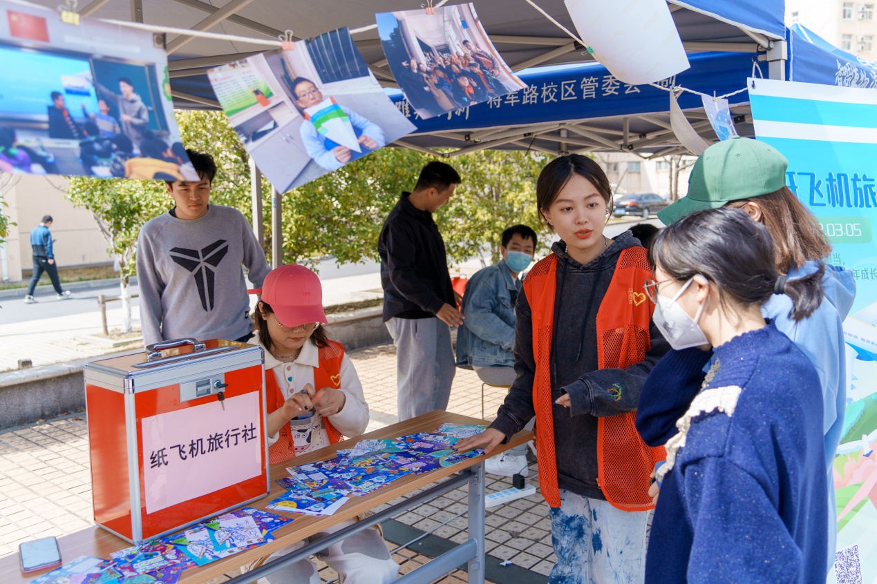 光盲之路”展位为每位前来的同学送上一张手绘的盲人相关文创;“小红花”留声机前,是一个个大哥哥大姐姐录下叮咛与寄语;“情系溧阳”团队整理了100道有关雷锋同志生平及事迹的题目;“民航说”展位准备了“纸飞机旅行社”的门票,正面是一张张写满祝福的明信片,反面是孩子们创作的航空航天民航元素的图画。