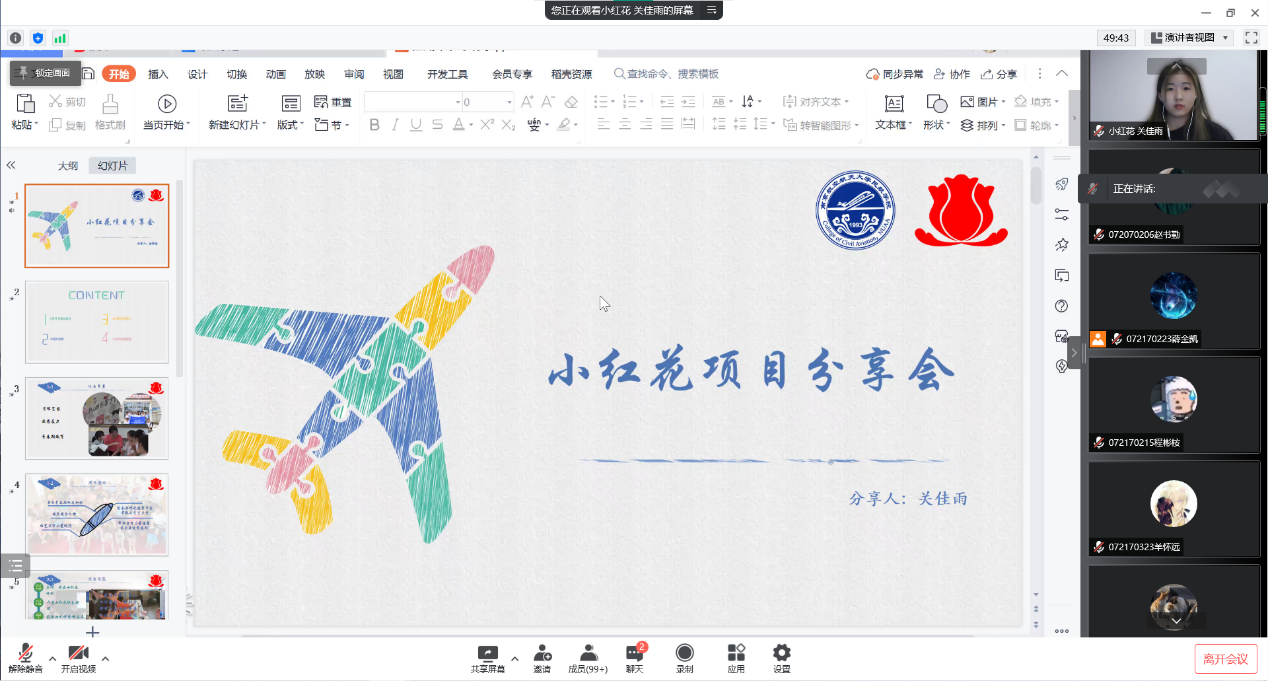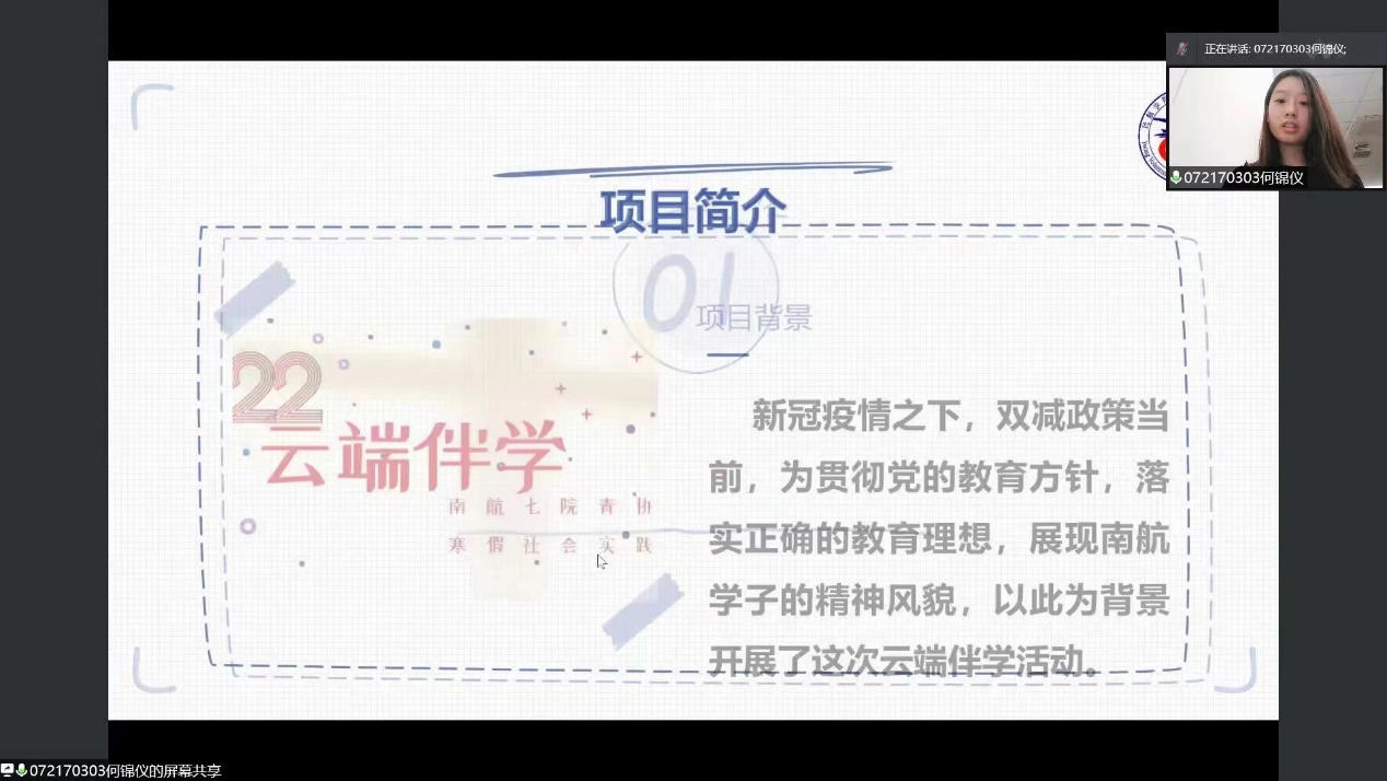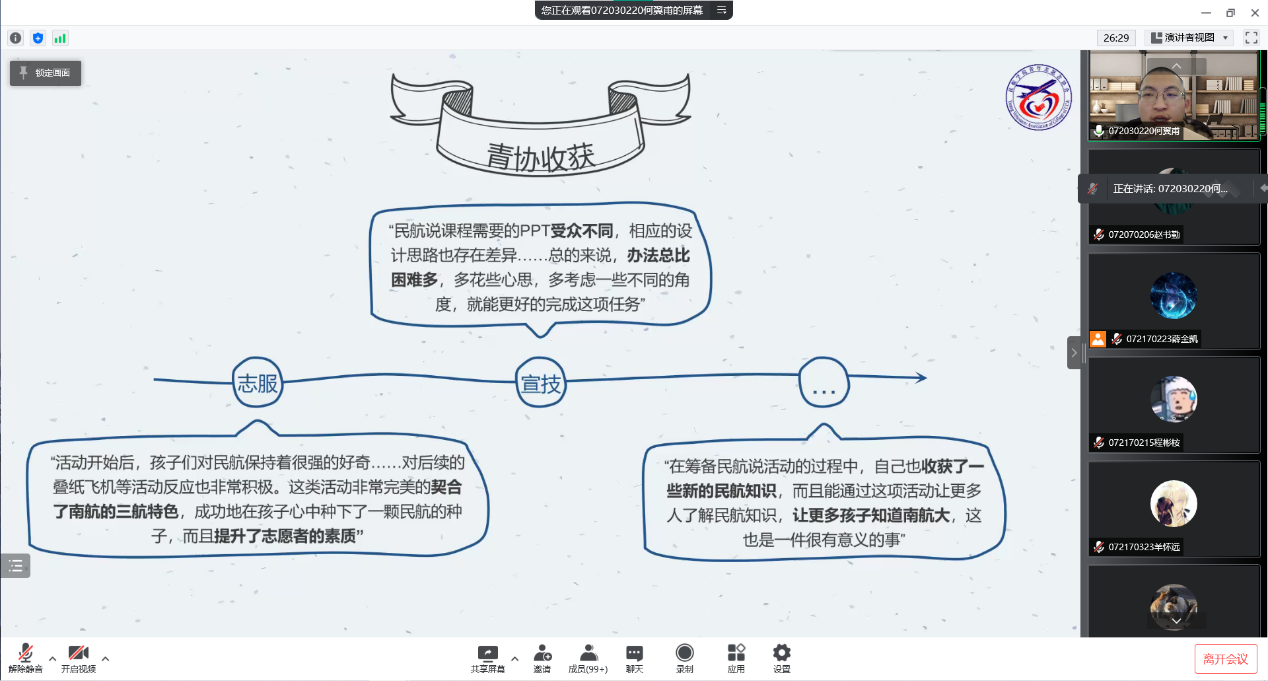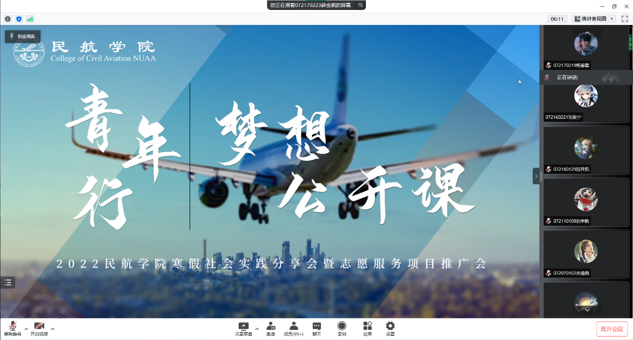 为了帮助民航学子更好地在实践中展现青年风采,在志愿服务中传递民航精神,4月9日晚,成人动漫 “青年行”梦想公开课在线上开展,学院2022年度寒假社会实践优秀团队及学院示范性志愿服务团队依次进行经验分享和项目推广。院团委书记赵慧文、院学生会各部门成员以及本科低年级学生参加了此次分享会。