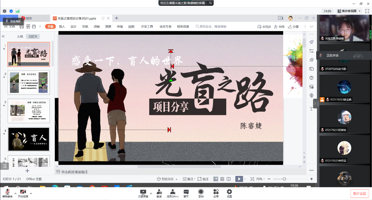 “光盲之路”团队成立于2012年,在南京青奥会前,南京市政府提出了“无障碍 创人文 迎青奥”的筹备口号,“光盲之路”项目应运而生。经过10年的耕耘,团队走过全国40余座城市,进行了大量的盲道状况、城市无障碍设施情况的调研,同时也展开了大量陪伴就医、陪伴出行等聚焦解决“盲人身心健康”问题的志愿活动。他们的故事收获了150余家媒体报道,并获得校级社会实践长期立项。