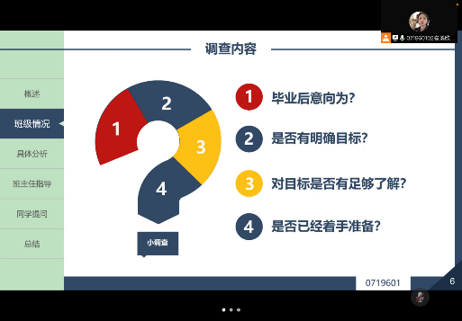 第一期课程中,0719601班班长崔瑀欣对同学们今后的发展意向和规划等情况做了详细汇报,陈嘉宇强调了明确未来方向和做好未来规划的重要性,并结合个人求学经历,就如何平衡学习、生活和工作,给出了个人的意见和建议,引发了同学们的广泛思考。