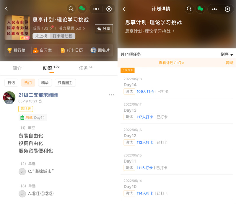 为认真贯彻落实习总书记关于党史学习教育的重要论述精神,营造良好的党史理论学习教育氛围,学习百年党史,汲取奋进力量,将红色基因融入血脉,成人动漫 组织各研究生党支部于2022年5月5日至18日推出“思享”计划·14天理论学习打卡活动,进一步提升党员们理论知识学习的主动性。