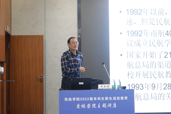 朱金福如数家珍讲述学院和民航业的发展史和大事件。改革开放以后民航业飞速发展,在国家部委、学校和校友们的鼎力支持下,成人动漫 于1993年正式成立并一步步发展壮大,离不开一代代民航人的不懈努力和接力奋斗。随后,朱金福从行业角度,用客观数据向同学们普及了民航及其发展前景,呼吁同学们开阔国际视野、树立创新意识、保持优秀品格、锻炼专业思维,为今后在民航发展前沿的奋斗路奠定基础,将实现民航强国理想成为矢志不渝的精神追求和终生事业。面对学习困难,他比喻道:“困难就像山,逃避积攒,山峰便会高耸入云;逐一击破,便会坦坦荡荡一马平川。”最后,朱金福向同学们提出殷切期盼,他希望同学们秉持“团结、俭朴、唯实、创新”的八字校风,让“爱校”成为大家的行动自觉、让“荣院”成为共同的使命担当,加倍努力、奋勇争先,相信自己、相信专业、相信学校,珍惜时间、把握当先、逐梦前行,以奋发向上的姿态和孜孜不倦的精神,成为更加优秀的民航人!