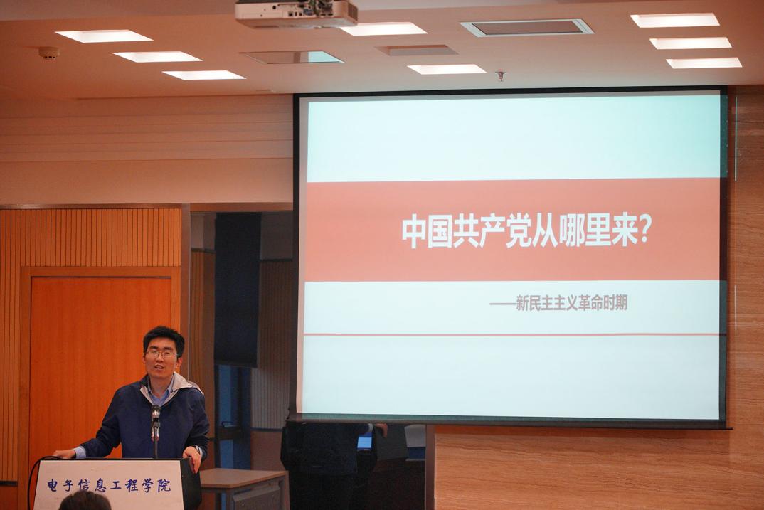 开班动员后,校团委副书记王洋以《中国共产党从哪里来》为题为积极分子讲授专题党课。王洋老师将新民主主义革命时期中国共产党的发展分为了“横空出世”“步履维艰”“绝处逢生”“挫败连连”“死里逃生”“大道之行”六个阶段,通过对六个阶段标志性事件和人物的描述,详细介绍了中国共产党成立的历史进程,系统分析阐明了历史和人民为什么选择中国共产党。他讲到“历史是最好的老师”,以此强调学习党史的重要性。他还讲到中国的革命愈挫越勇,正是无数中国共产党人“因为相信而看见”,而不是“因为看见而相信”,才使得中国共产党走过了这条无数次被堵死的路,而且越走越宽阔。他表示,希望同学们切实增强理论自觉,坚定信仰和信念,心中有理想,脚下有力量,主动投身于新时代中国特色社会主义伟大事业新征程。