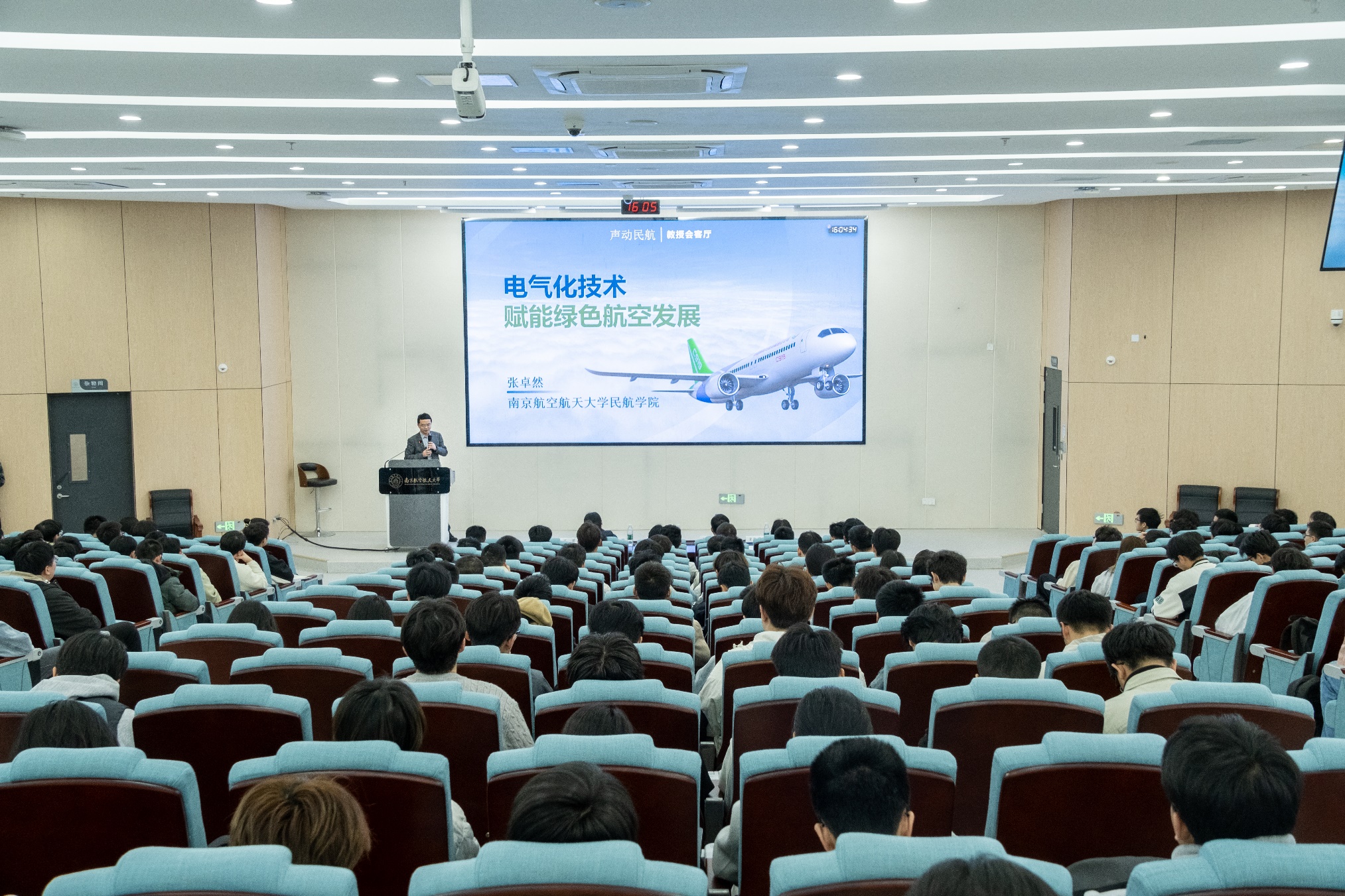 张卓然立足行业发展前沿与国家战略需求,对绿色航空发展的必要性与紧迫性进行系统阐述,并从绿色飞机、绿色机场和绿色飞行三个维度解读航空产业低碳转型的技术路径。他向同学们介绍了飞机电力系统的组成和功能,着重分析多电/全电飞机、电推进飞机的技术优势,并以此为引入介绍航空电气化背景下绿色航空的发展路线和应用前景。