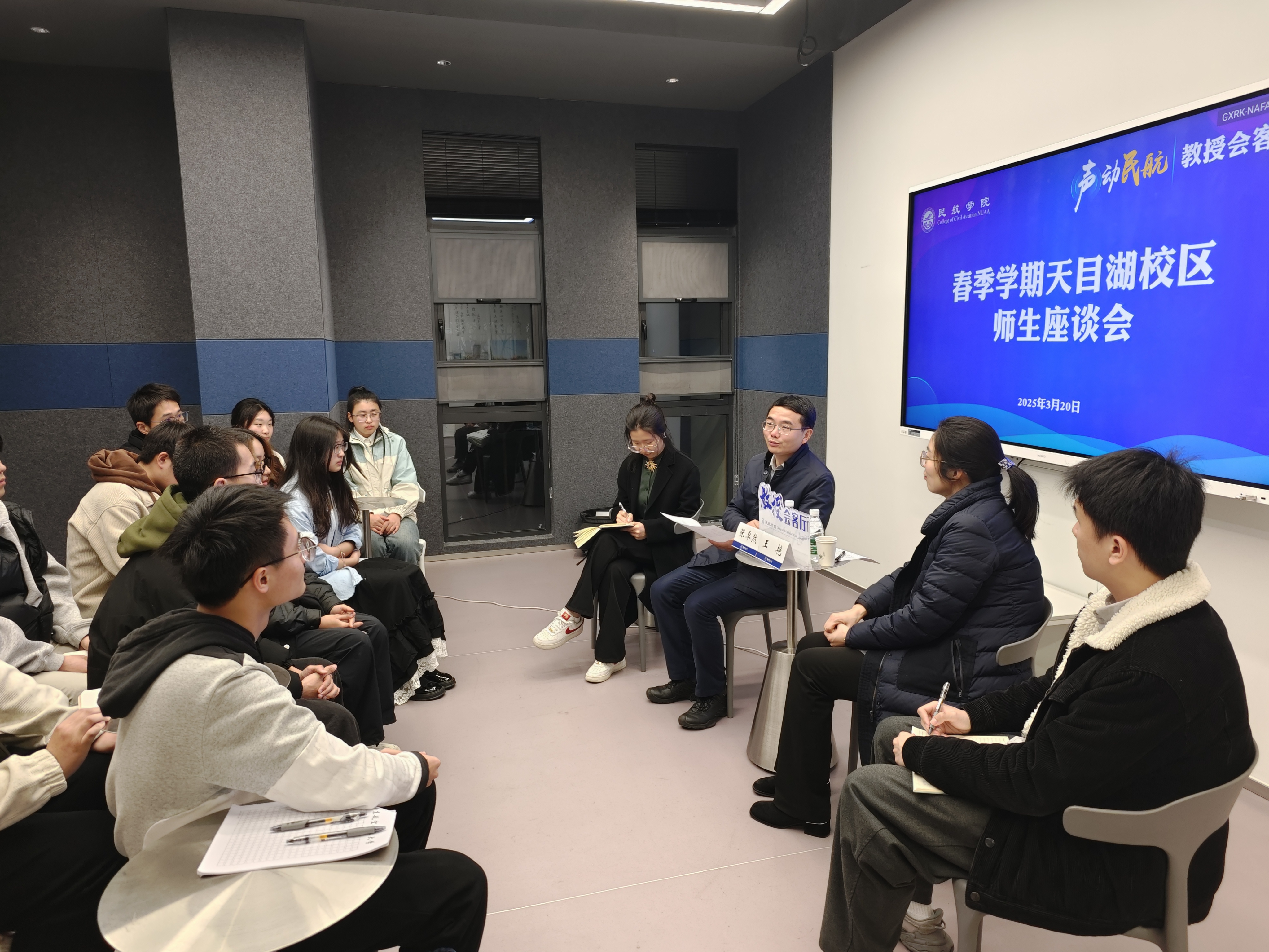 讲座后,学院分别组织召开春季学期天目湖校区师生座谈会和民航工程系师生座谈会,系统调研同学们关于学风建设、科创竞赛、课程设置、生涯规划、文体活动等方面的困惑并给予指导。