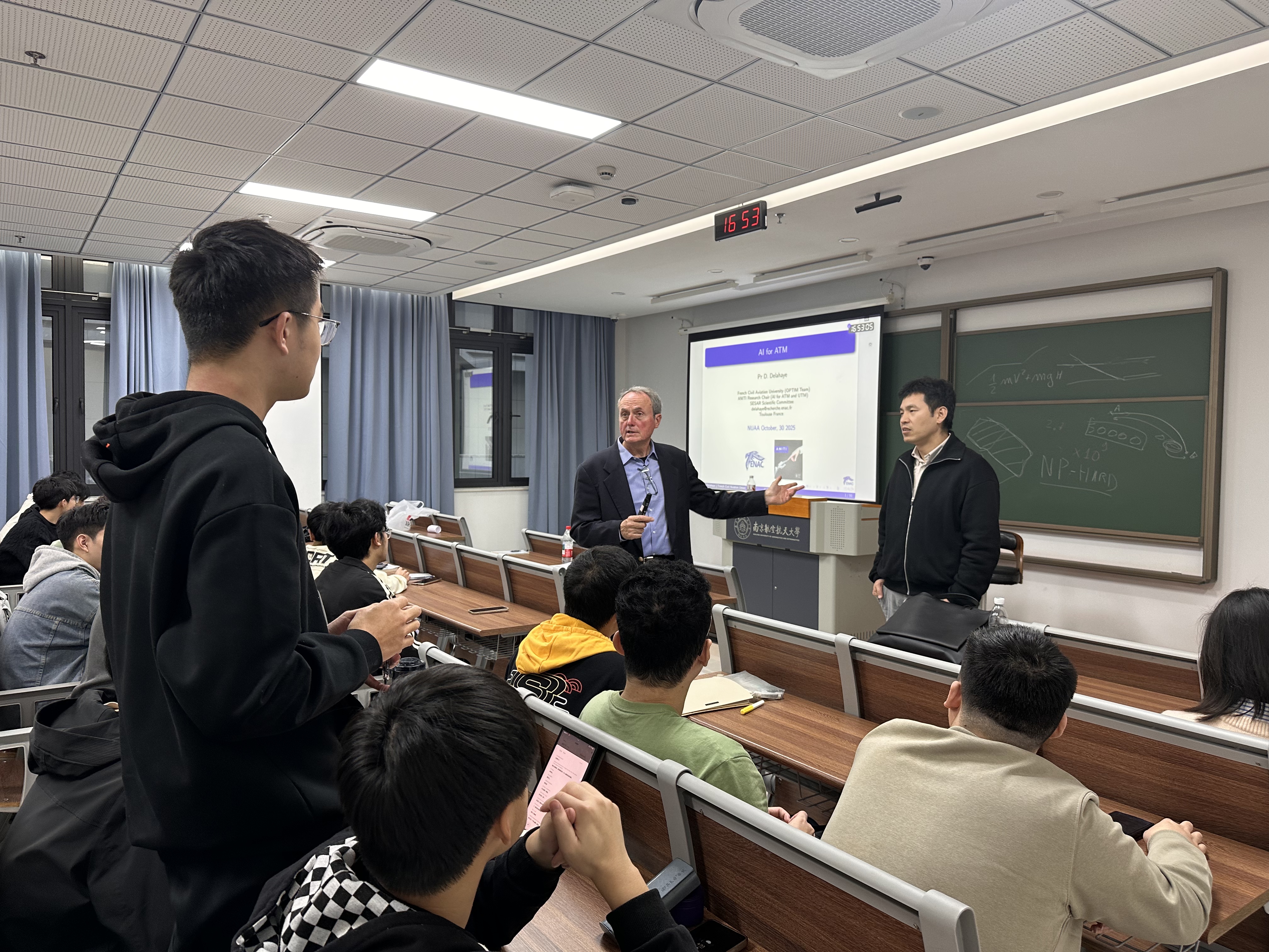 为帮助学生深入了解人工智能技术在空中交通管理(Air Traffic Management,ATM)领域的前沿应用与未来发展,10月30日,成人动漫 在天目湖校区T2311教室举办《AI FOR ATM》专题讲座。讲座特邀外籍教授Daniel Delahaye进行全英文讲授,空管系教师王艳军、辅导员王雨薇和2024级空管专业全体学生参与。