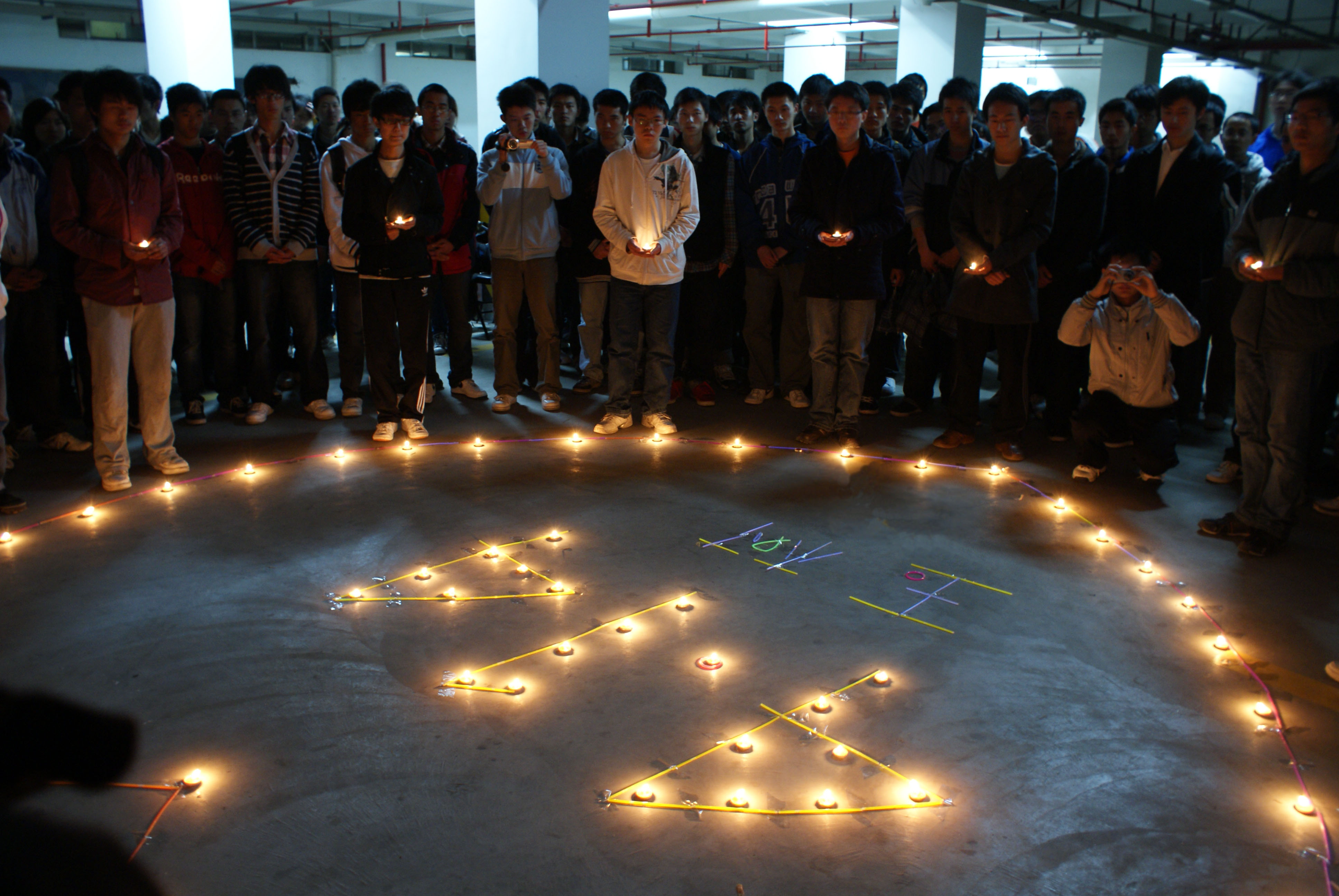 音乐声起,随着一个青海籍的男生点亮了第一支蜡烛,烛光在全场亮起,爱心也在南航学子们的心中传递。跳跃的火苗拼凑成心的形状,包围着数字状的四月十四,这是玉树地震的日子,是举国同悲的日子,是我们纪念的日子。火光照在每个人的脸庞上,映出一颗颗赤诚之心最深处的哀悼。感觉一夕之间,见证了灾难的每个人都长大了些许,有了对于生命,对于生活的全新认识。