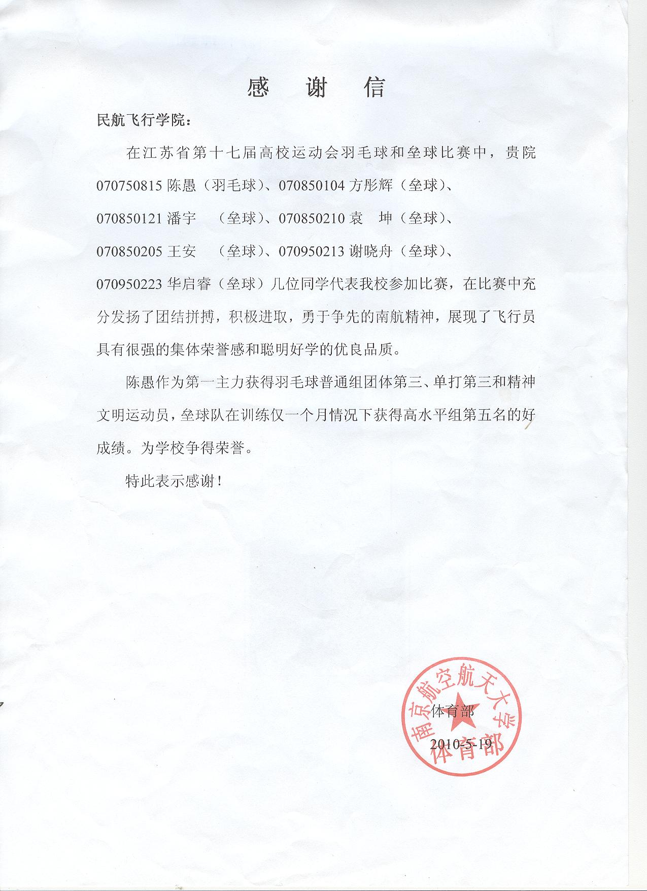 5月13至15日,我院08级飞行学员方彤晖、潘宇、袁坤、王安,09级飞行学员谢小舟、华启睿代表学校参加江苏省第十七届运动会,克服训练时间短、比赛经验不足等不利情况,凭借出色的发挥,最终夺得高校部高水平组垒球比赛第五名,为我校、我院争得了荣誉。