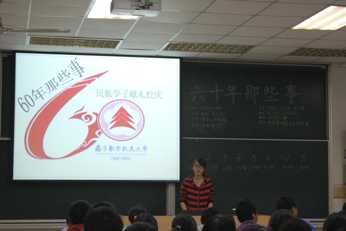 在开学初的第一次年级大会上,成人动漫 2012级所有学生观看了南航发展六十年的视频,视频生动再现了南航的历史与积淀,也让新生对南航,对这个即将生活四年的地方有了直观的认识。同时,年级大会上辅导员也以南航六十年发展轨迹为线索,结合2012级新生的成长脚步,以“南航——成就梦想的地方”为题向大家讲述了梦想的南航,让新生与南航建立了新的链接,有了更加感性的认识。为了让各位同学尽快的适应大学的学习生活,了解南航,在新生军训期间,学导们也深入到宿舍中,介绍南航,向同学介绍他们眼中的南航,他们在南航遇到的人、发生的事,逐渐增加了同学们对了解南航历史的兴趣。建立了理性与感性的认识之后,年级建立了自主学习网络平台,在人人网、年级微博上对校史知识进行介绍,同学们通过浏览网页和留言互动,进一步加深了对校史知识的掌握。
