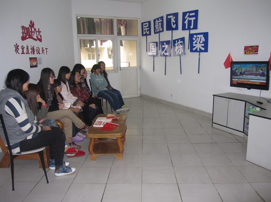当天上午八点整,在民航/飞行学院优秀党员宿舍、先进班级宿舍和新生宿舍,众多学生齐聚一堂,拉开了本次活动的序幕。在优秀党员宿舍和新生宿舍,红旗和红色横幅高高挂起,红色书籍闪烁红色之光,手工裁剪的标题也十分醒目,在一派喜气洋洋的氛围下,学院同学进行了生动有趣的十八大知识竞赛,增长了自身的党政知识;在先进班级宿舍,学院2011级学生畅谈十六大以来祖国的十年巨变,述说自己身边的幸福;新生宿舍中,新生们交流讨论五年来民航的大发展,回顾党的光辉历程,传承党的伟大精神。每个宿舍,学院特邀的老师与同学们都亲切互动,为同学们讲解党政知识,增强大家对党的认识。