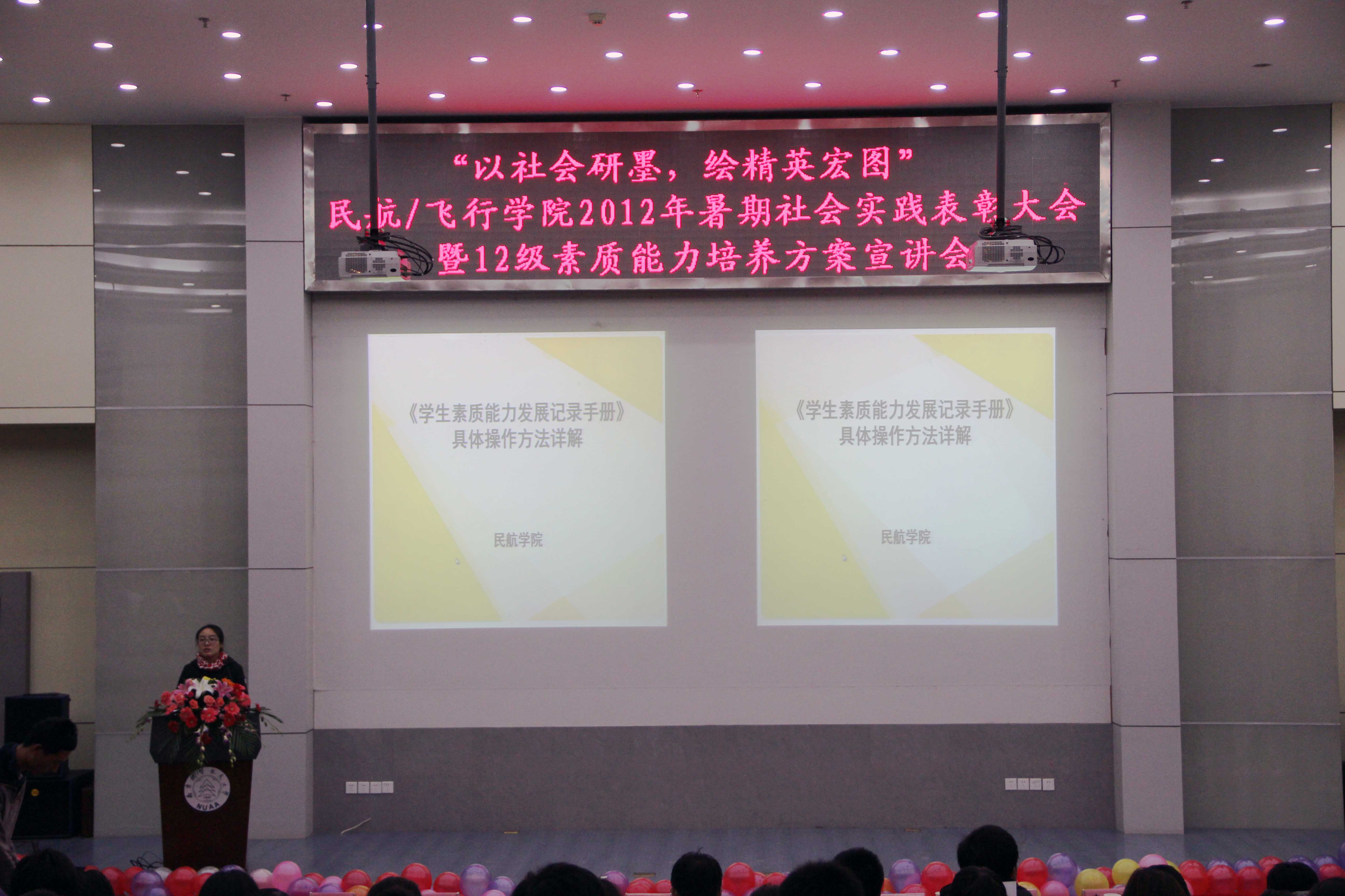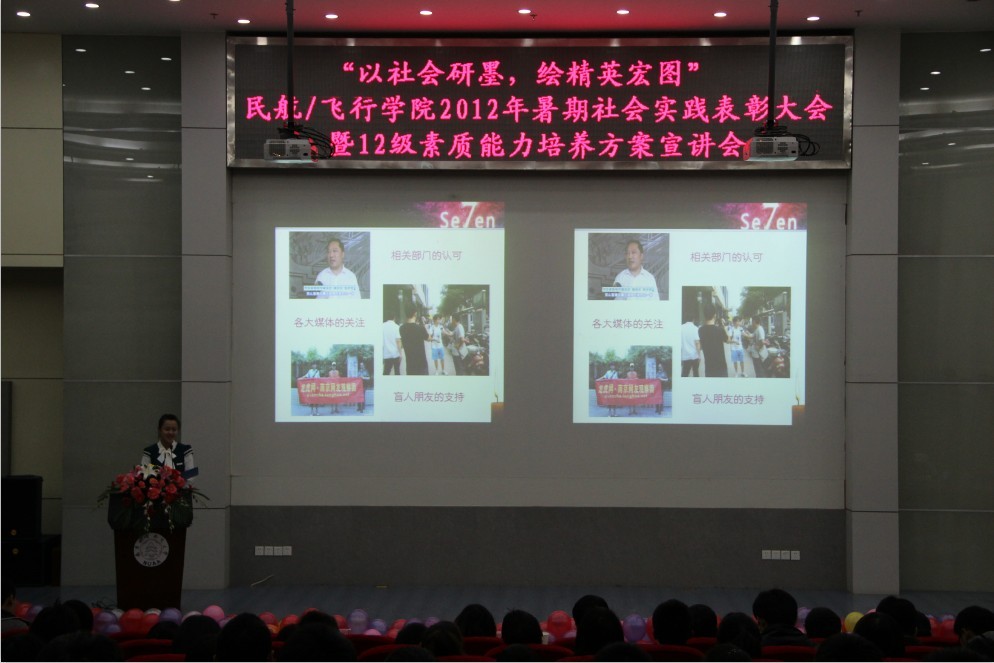 民航/飞行学院2012年暑期社会实践表彰大会暨12级素质能力培养方案宣讲会在一号教学楼四楼报告厅隆重召开。民航/飞行学院党委副书记高健老师,团委书记傅成成老师,各年级辅导员及12级全体同学参与本次大会。 较之以往,此次社会实践表彰大会创造性的与12级素质能力培养方案相结合,不仅向12级同学展示暑期社会实践的震撼,同时用具象化的实例展现当代民航人应具备的能力。结合民航/飞行学院为12级新生提炼的六大精英素质,表彰大会分为四个篇章。第一篇章“御风天涯,花开四方”中,“征蓬团队”探寻帕米尔高原上边防生活,民航小伙用心中的理想克服重重困难;“海角七号”团队以情联系两岸,践行着“海峡一家亲,共促两岸情”的共同信仰。第二篇章“关爱残弱,花开阳光”中,“爱心通途”团队绘制千里盲道图,只为盲人多一份平安。民航人体察着社会最容易被忽视的细节,担当着社会最义不容辞的责任。第三篇章“书本内外,花开梦想”中,民航人在实践中学习,向基层百姓学习,启迪12级同学乐于学习,不断完善自我。第四篇章“献礼校庆,花开无疆”中,伶言集礼的航迹天下团队通过多种方式表达对母校的热爱,让12级新生意识到表达能力在民航系统的重要性。 随后,领导们为在实践活动中表现优异的个人和团体颁发奖状。最后,民航/飞行学院党委副书记高健老师针对暑期社会实践活动的相关成果发表讲话,再一次对“理想信仰”、“责任意识”,“学习能力”、“表达能力”、“艺体素质”进行详细解读,表达了对民航/飞行学院学生成为合格的民航人、未来的民航精英的期待。 本次暑期社会实践表彰大会在震撼人心之余,也让12级新生深刻意识到作为未来民航人所需的素质能力。相信通过这次社会实践表彰大会,民航/飞行学院的学子会对今后的个人素质能力提升有一个更高的要求和合理的规划,成为未来民航系统的精英人才。 |