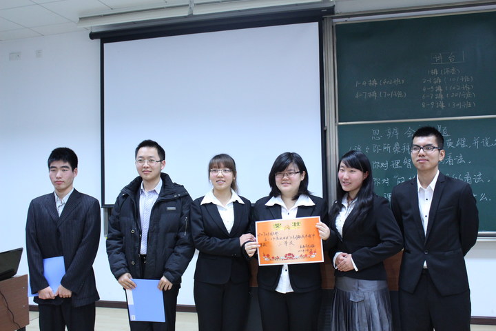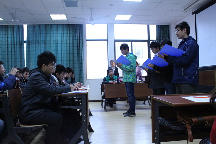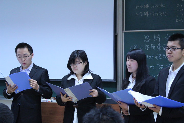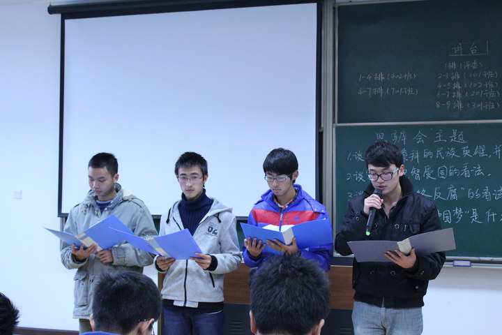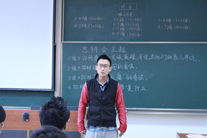第二篇章为红色论坛思辨会。此次思辨环节采取随机抽取的方式,根据黑板上提前写好的思辨议题,抽到的同学依次到讲台上发表自己的见解。思辨议题包括网络反腐,中国梦等实事热点话题。在思辨环节中,同学们有深度地阐释了自己的看法,表现了当代大学生良好的政治素养。台下的同学们与台上的同学们还进行了思想的碰撞与交流,气氛热烈。