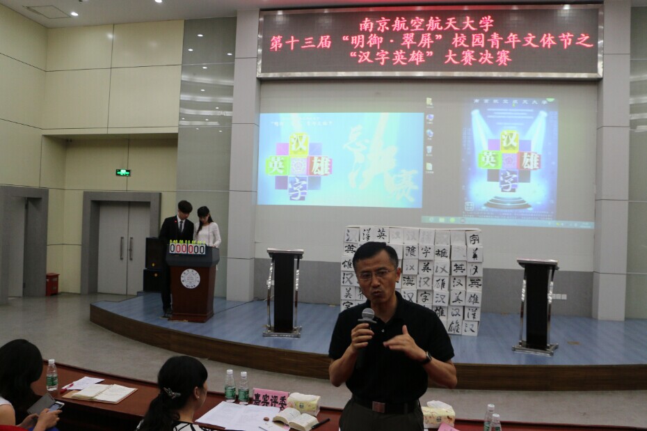 第十三届“明御·翠屏”青年文体节之首届汉字英雄大赛决赛。南航人文社会与科学学院教授邱建新老师、普通话省级测试员张书洋老师作为评委出席了本次活动。到场的还有老师代表及众多南航学子,他们共同领略汉字魅力,并为参赛选手加油鼓气。