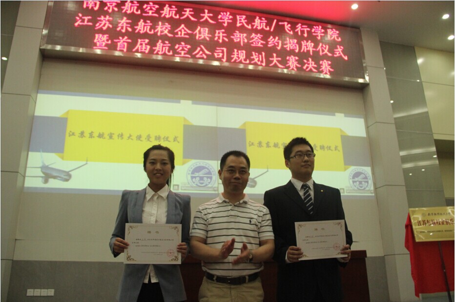 6月13日晚,江苏东航校企俱乐部签约揭牌仪式在我校将军路校区一号楼报告厅隆重举行,江苏东航人力资源部规划配置部管理主管王心磊、飞机维修部副总经理兼总工程师肖志华、飞行签派分部高级经理杨加勇、飞机维修工程部工程师陈勇、人力资源部王树红,校学生处副处长许爱华、成人动漫