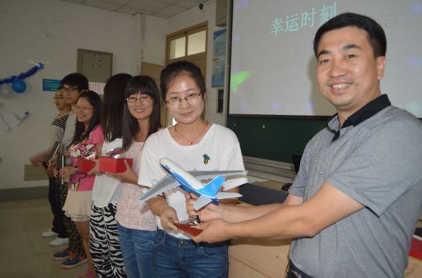 在这趟特殊的航程中,为了加深新同学们之间的了解,我们还特意加入了机上娱乐环节。组织了“你来比划我来猜”这个小游戏。同学们都跃跃欲试,反应强烈,迅速火热地打成了一片。紧接着是幸运抽奖环节,由我们的特邀嘉宾孙占久部长在新生入学时保留的机票副票中抽取一二三等奖,并为获奖的同学进行颁奖。孙部长表示对14级新生寄予了厚望,希望大家能在新的人生阶段再接再厉,勇攀高峰。