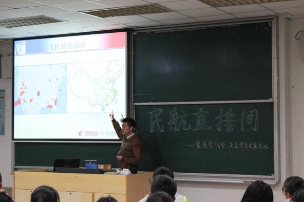 2014年12月4日晚18点30分,民航/飞行学院“聚焦民航,共话发展”交流论坛暨民航/飞行学院二级团校民航直播间活动于将军路校区6201教室成功举办。特邀嘉宾江苏东航签派放行带班经理赵浩若及民航/飞行学院团委书记傅成成出席此次活动。