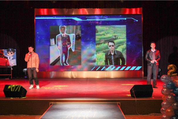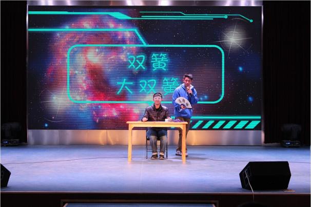 在外国语学院同学带来的动感舞蹈后,一系列的语言类节目也将跨年迎新会推向一次次高潮。短剧《约么》夸张的表演令人捧腹大笑,大一各班班长的方言版朗诵《我的滑板鞋》引发全场观众的激情,“爱笑你就来”决赛的四支队伍更是接连带来《口吐莲花》、《满腹经纶》、《大双簧》等多个精彩节目,在语言的诙谐碰撞中与现场观众共同迎接2015的到来。最终,成人动漫 大二两名同学凭借默契幽默的双簧表演夺得“爱笑你就来”冠军,团委书记傅成城老师亲自为其颁奖并合影留念。