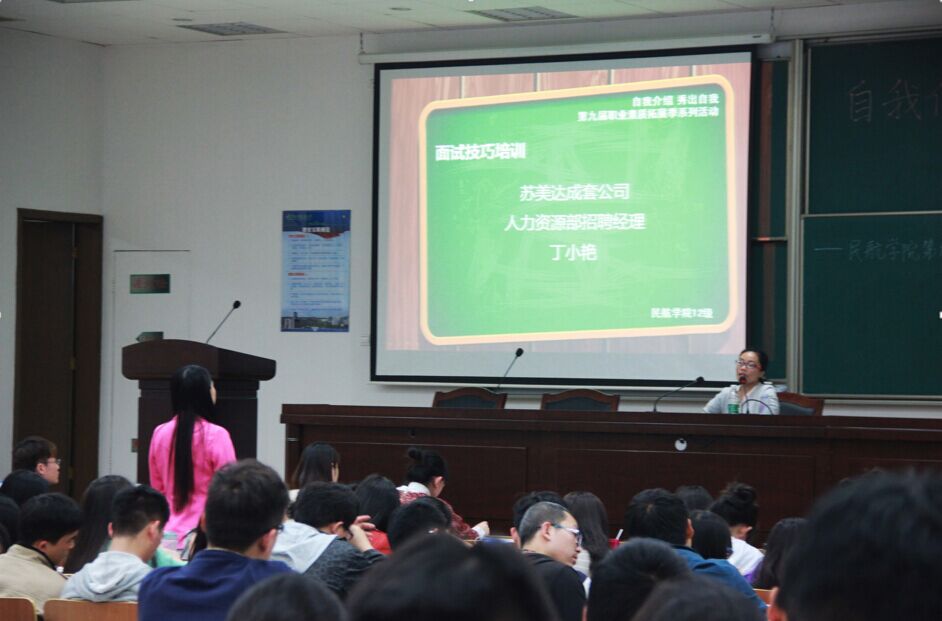 随着就业工作推进,航空公司校企联合培养面试开启在即,为了让学生以完美的方式展现在面试官的面前,2015年4月22日晚7点,成人动漫 开展了职业素质拓展季系列活动之“自我介绍,秀出自我”讲座,邀请苏美达成套公司人力资源部丁小艳经理、成人动漫 拥有六年就业工作经验的辅导员傅成成开展讲座。