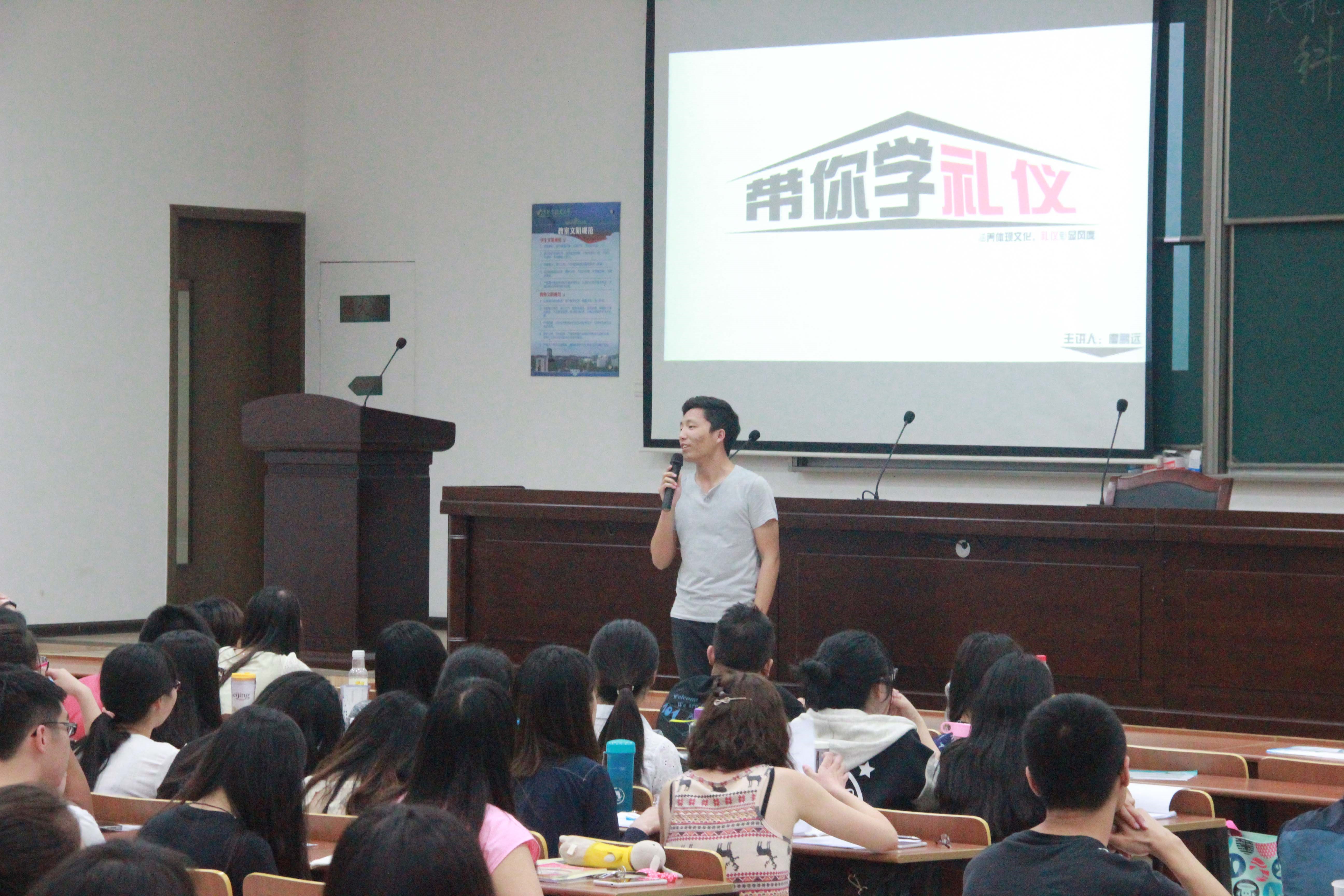 第二部分为礼仪培训部分,廖鹏远为11级学生,如今已经签约中兴公司总裁办,具有丰富的演讲、礼仪培训的经验,他的讲解主要从男生正装,女生正装,面试礼仪三个方面展开,在模特志愿者的协助展示下,廖鹏远幽默风趣的讲解,使在座同学对于如何选择正装,如何搭配,如何面试等收获良多,受益匪浅。