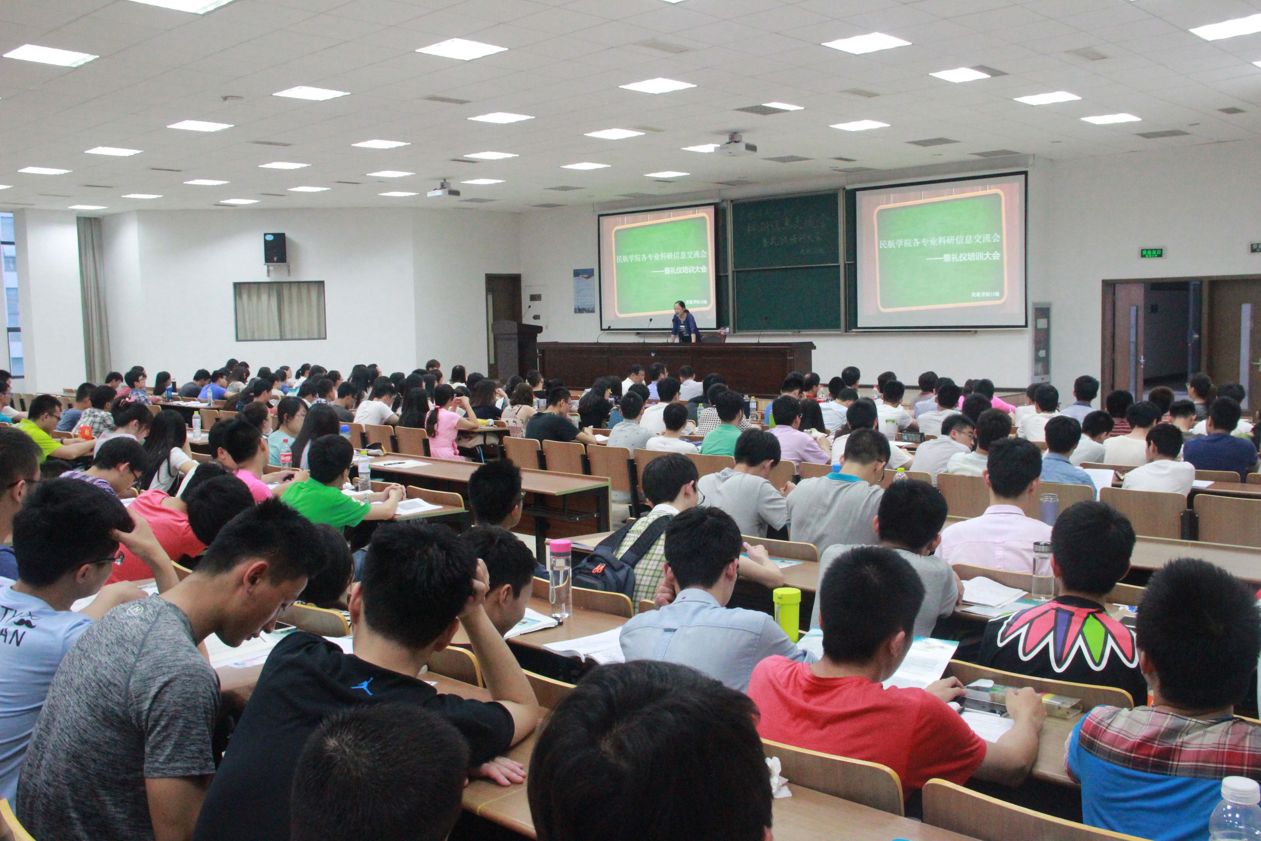 大三学年将近尾声,读研、就业越来越成为同学们面临的难题,面对同学们对未来道路的疑惑,以及面试礼仪知识的相对缺乏等问题,2015年5月19日,成人动漫 12级举行科研信息交流会暨礼仪培训大会,邀请成人动漫 副院长葛红娟、交通运输系教授朱金福、空管系主任田勇、空管系副主任张军峰、工程系副主任吴海桥、飞行系副主任高振兴、飞行系教师桑保华、教务员陶宁、研究生辅导员谢菲到场为同学们答疑解惑,同时邀请原大使团讲解队队长、成人动漫 11级廖鹏远学长为大家带来礼仪培训讲堂。