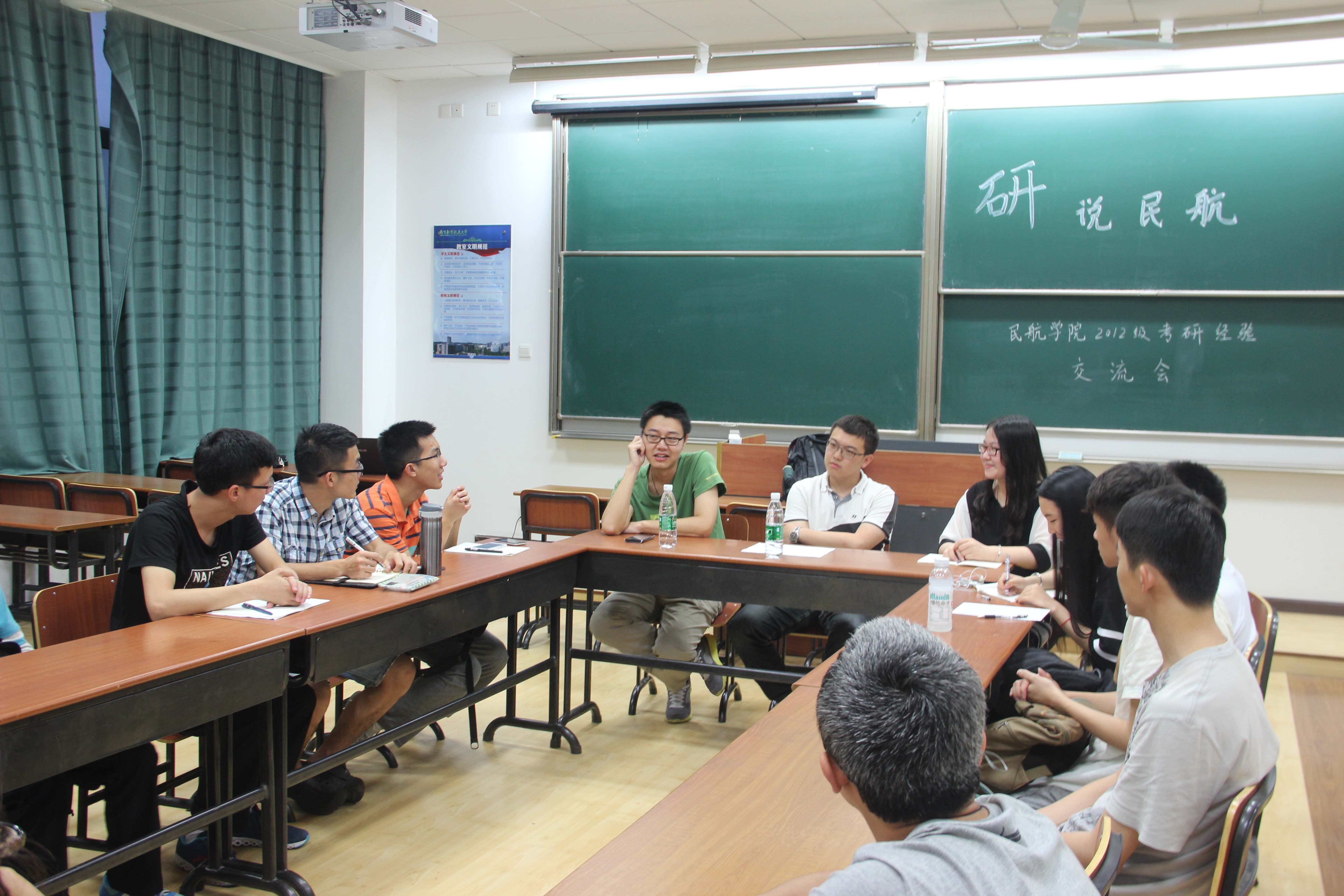 交流会上,两位同学详细介绍了考研的具体情况,并一一解答了同学们的疑问,交流气氛热烈。其中,贡英杰以初试345分考取我校机场运输与管理专业研究生。他表示,在保证正确方法和高效率的前提下,考研也可以是一个相对轻松的过程,他建议合理利用下午和晚上时间复习,晚上十点回宿舍休息的安排令在座同学深受启发。他还建议和研友结伴复习,互相监督,相互鼓励,更有助于长期坚持。王东明考研成绩总分396,考取中科大合肥微尺度物质科学国家实验室。学长强调考研前期心理准备的重要性,帮助在座同学明确了考研的意义和目标。他从参加夏令营、联系导师、复习的时间安排等多个方面对准备考取外校研究生的同学提出了实用建议。同时,两位还对提出了“自习不带手机”、“就寝之后保证睡眠质量”、“制定总体计划,把握复习进度”等经验之谈,令在座同学获益匪浅。