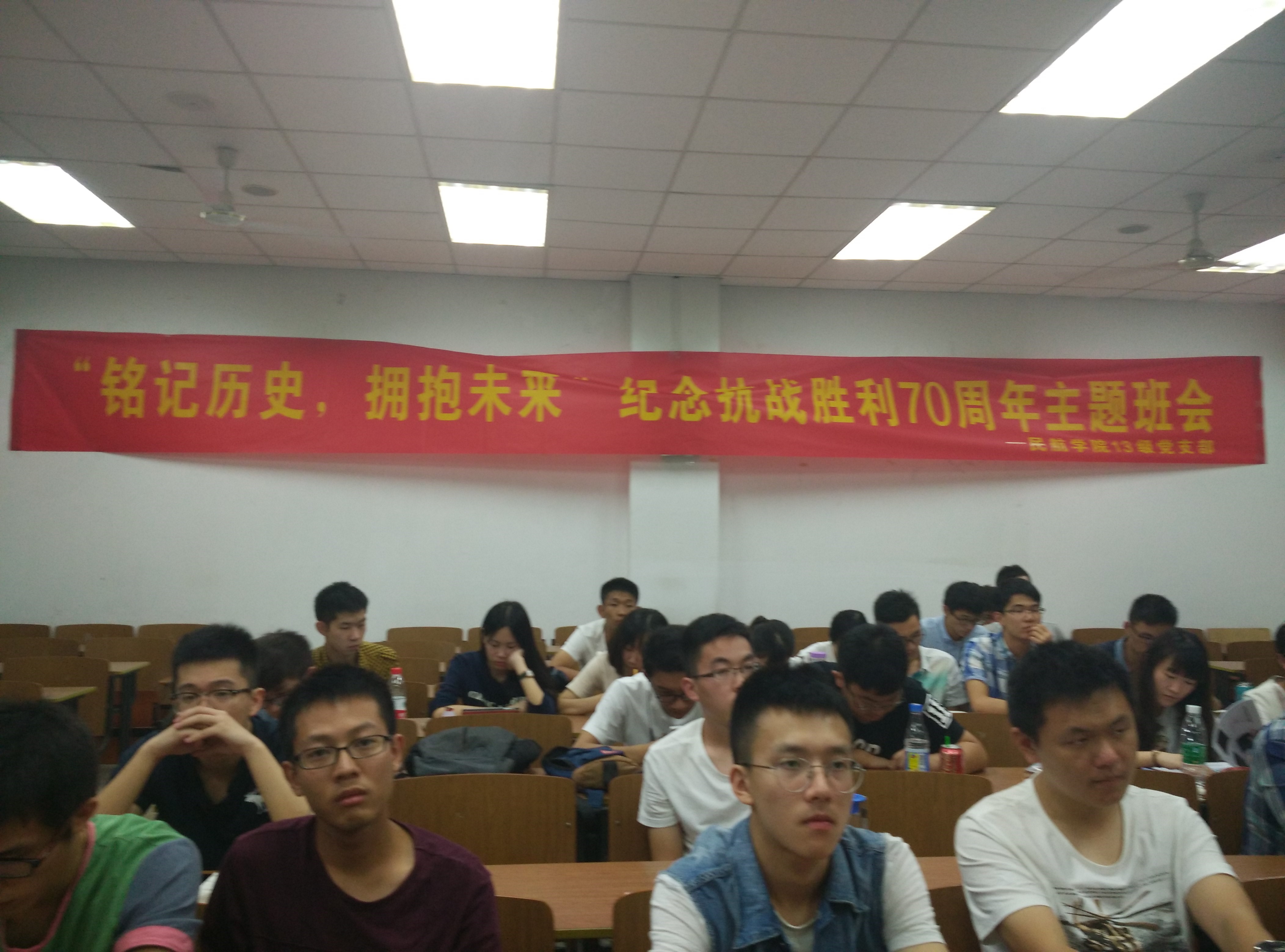 9月26日晚7点,成人动漫 13级党支部在6103教室开展了纪念抗战胜利70周年主题班会,13级全体党员、预备党员以及部分入党积极分子参与本次活动。