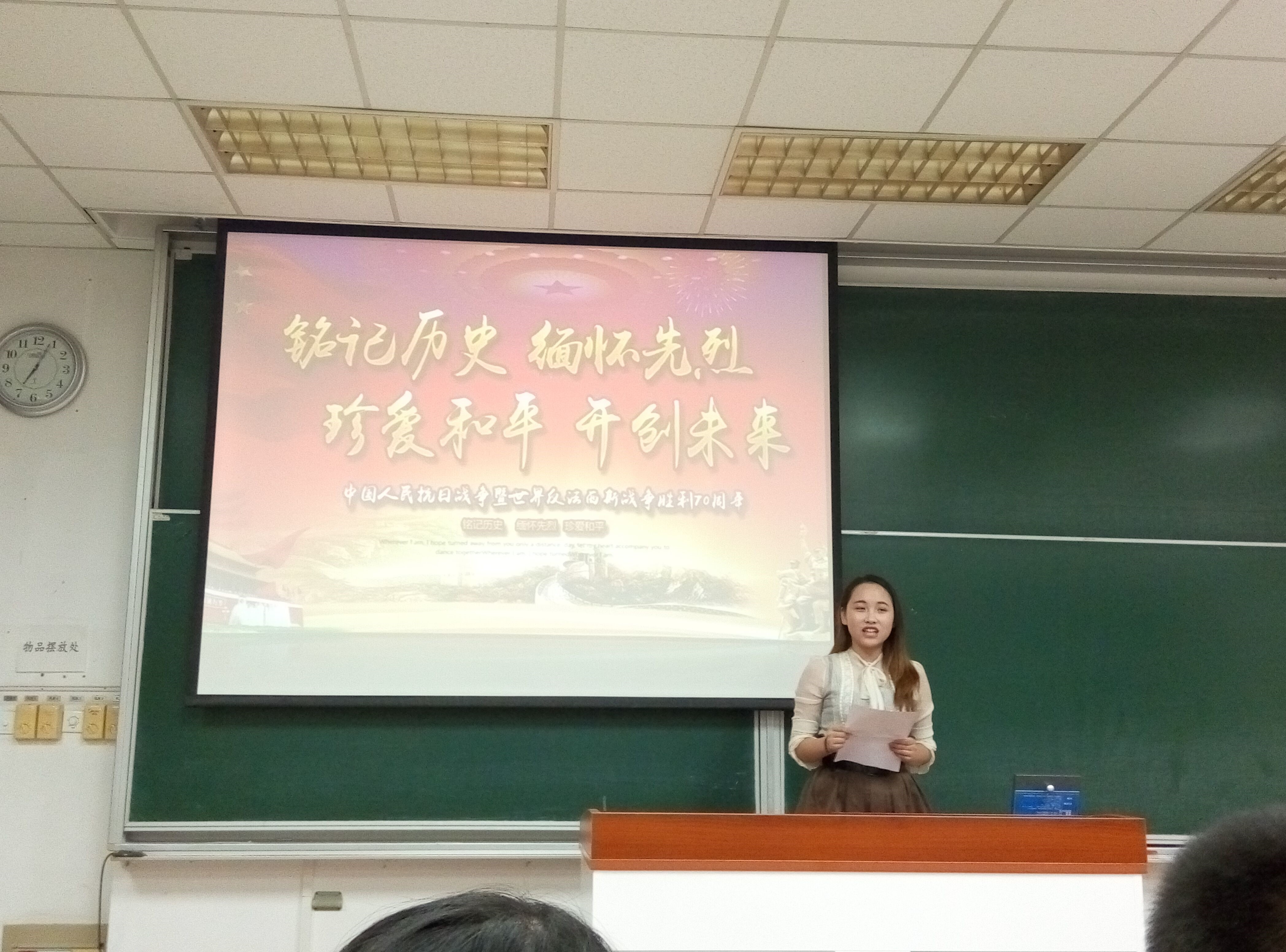 班会由一段极富深情的诗朗诵《那一年,这一年》开场,张婕和姜仕尧同学以抗战前后人民生活的对比,演绎出一代青年人对历史的敬畏和对祖国的热爱之情。随后,13级党支部书记路红飞针对网上存在对于历史的过分解读的现象提出自己的观点,他认为关注历史不可以偏概全,呼吁在场的每一位负责任的青年人独立思考,用全面理智的眼光看待问题。接下来进行的分享心目中最钦佩的英雄环节,演讲者将内心的悲痛、敬佩诉诸语言,在场的每一位同学都聚精会神。有演讲者提及被毛主席评价为“云水襟其被怀,松柏气节”的爱国名将续范亭,为警醒国人团结抗日,毅然刨腹自杀。有的演讲者回顾抗战过程,选取千千万万为和平努力抗争的普通民众代表邓玉芬,讲述了她家破人亡,毅然投身抗战的英雄行为。