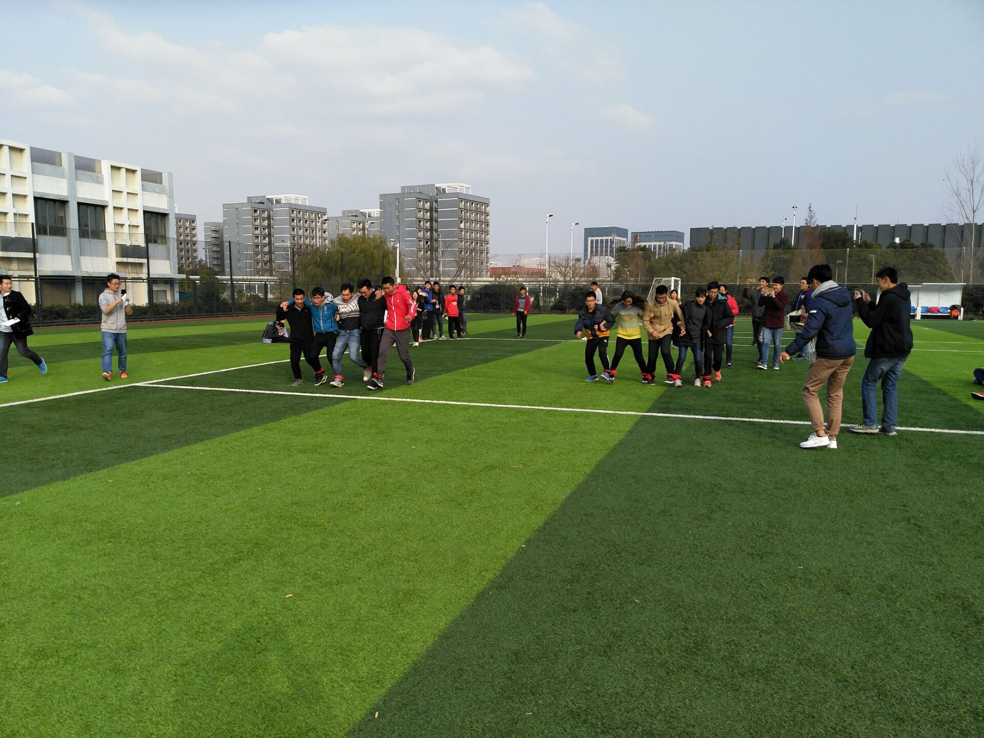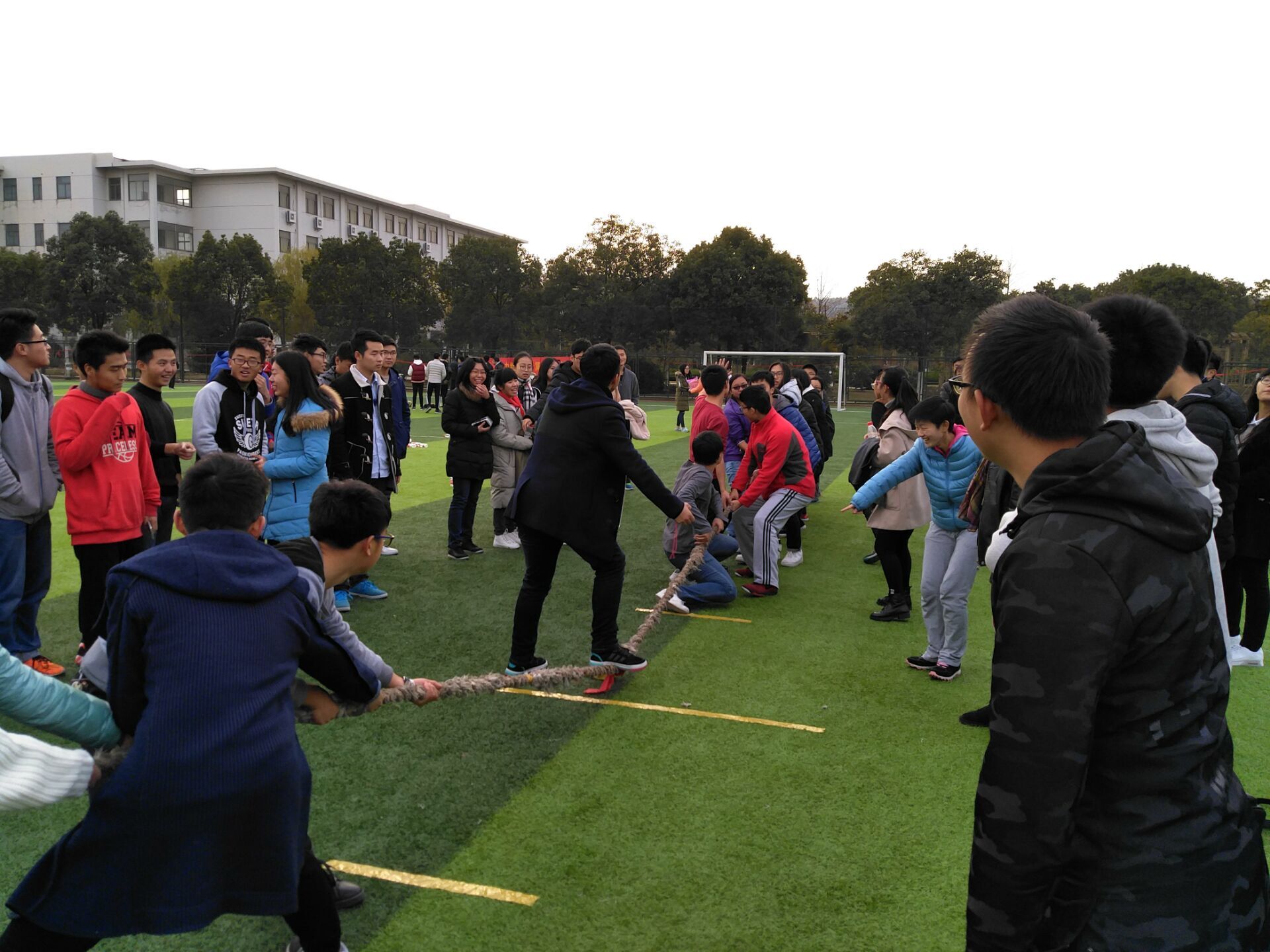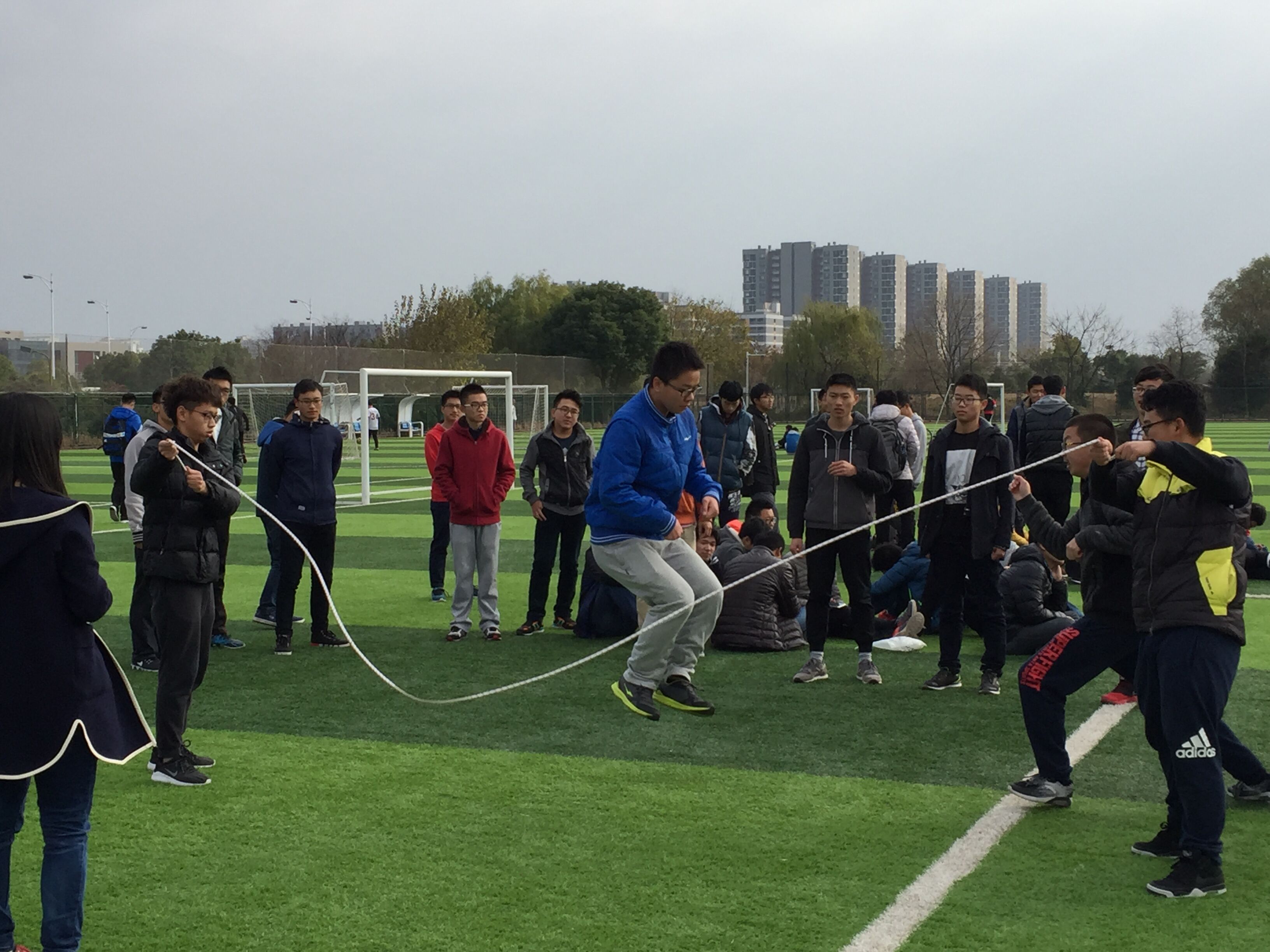 运动会在音乐声中拉开帷幕。首先进行的是热身项目跳大绳,每班代表队各派十二名同学上场角逐,成绩按2分钟跳绳总次数排序,其中103班力压群雄,位居首位。随后进行的是最激动人心的拔河,各班遵循各班男女力量均衡的原则选派队员,在预赛中分别进行了六场激烈对抗,303班、201班等六个班级成功进入复赛。在晋级的拔河运动员休息期间,第三个项目"五人六足"如火如荼地展开了。口号统一、步幅一致,103班和301班的五大金刚分别以7分27秒和7分54秒的成绩斩获冠亚军。同样有趣而新颖的运动项目“夹球接力跑”也拉开帷幕。四人分两组用后背夹球侧跑,裁判记录总用时来排名。选手们有的配合默契,全程高速跳跃未掉球,有的失误频频,没有找到合适的位置。最终,701班和401班以14分58秒和16分34秒的成绩名列前茅。经过复赛与半决赛的激烈竞争,拔河的冠军争夺赛终于开场。全场目光聚集在同一根麻绳两端气势汹汹的201班和701班的身上。比赛开始后,两队同学开场后不分伯仲,局面僵持不下,大家都巧妙地掌握了拔河技巧,侧身而倒并用体重增强鞋底与场地的摩擦。而后的咬牙坚持中,却是女生较多的201班更胜一筹,随着有节奏的口号声,拔河中心的红绳一步步地向201班的决胜线逼近,冠军由此诞生!