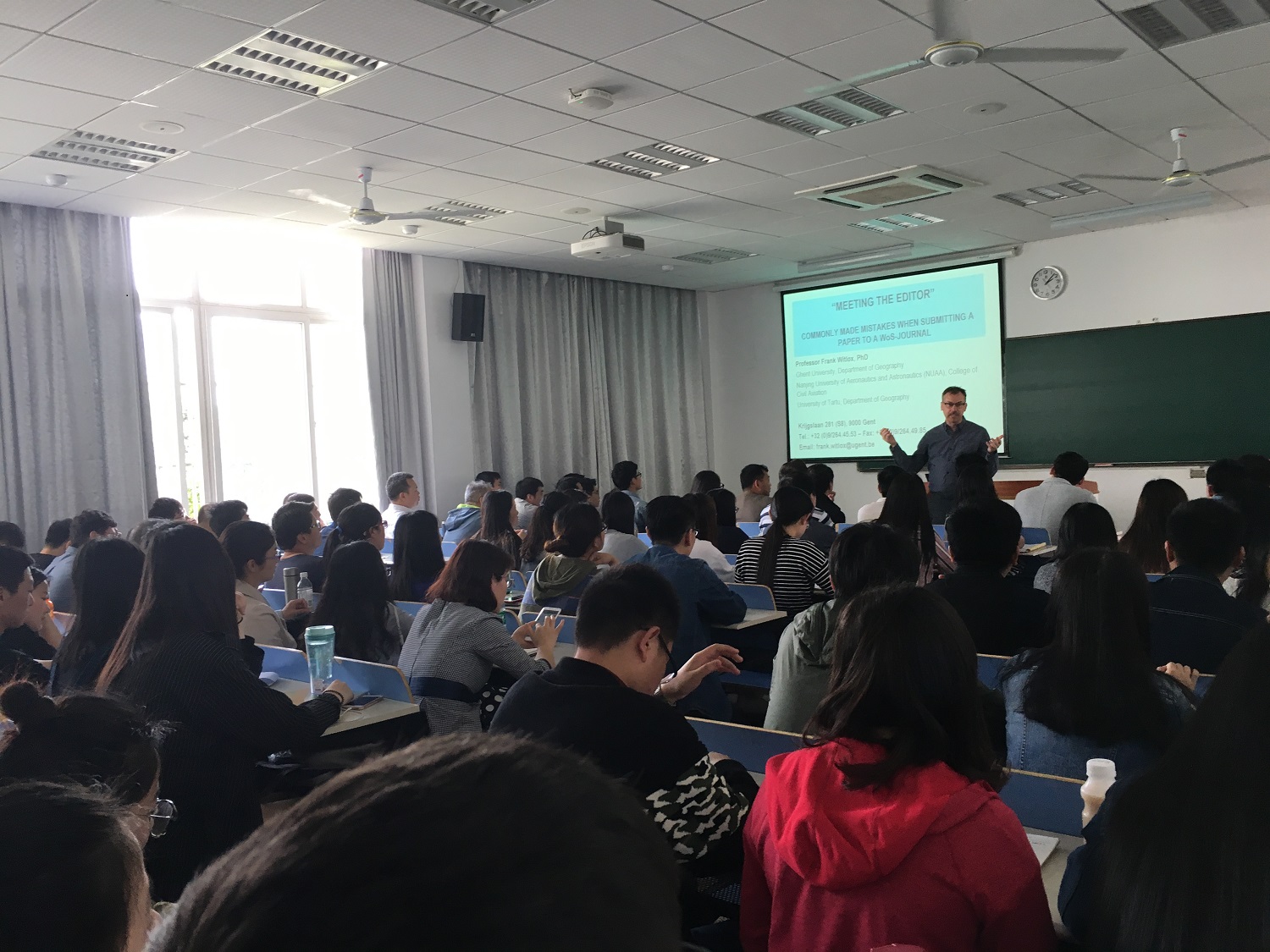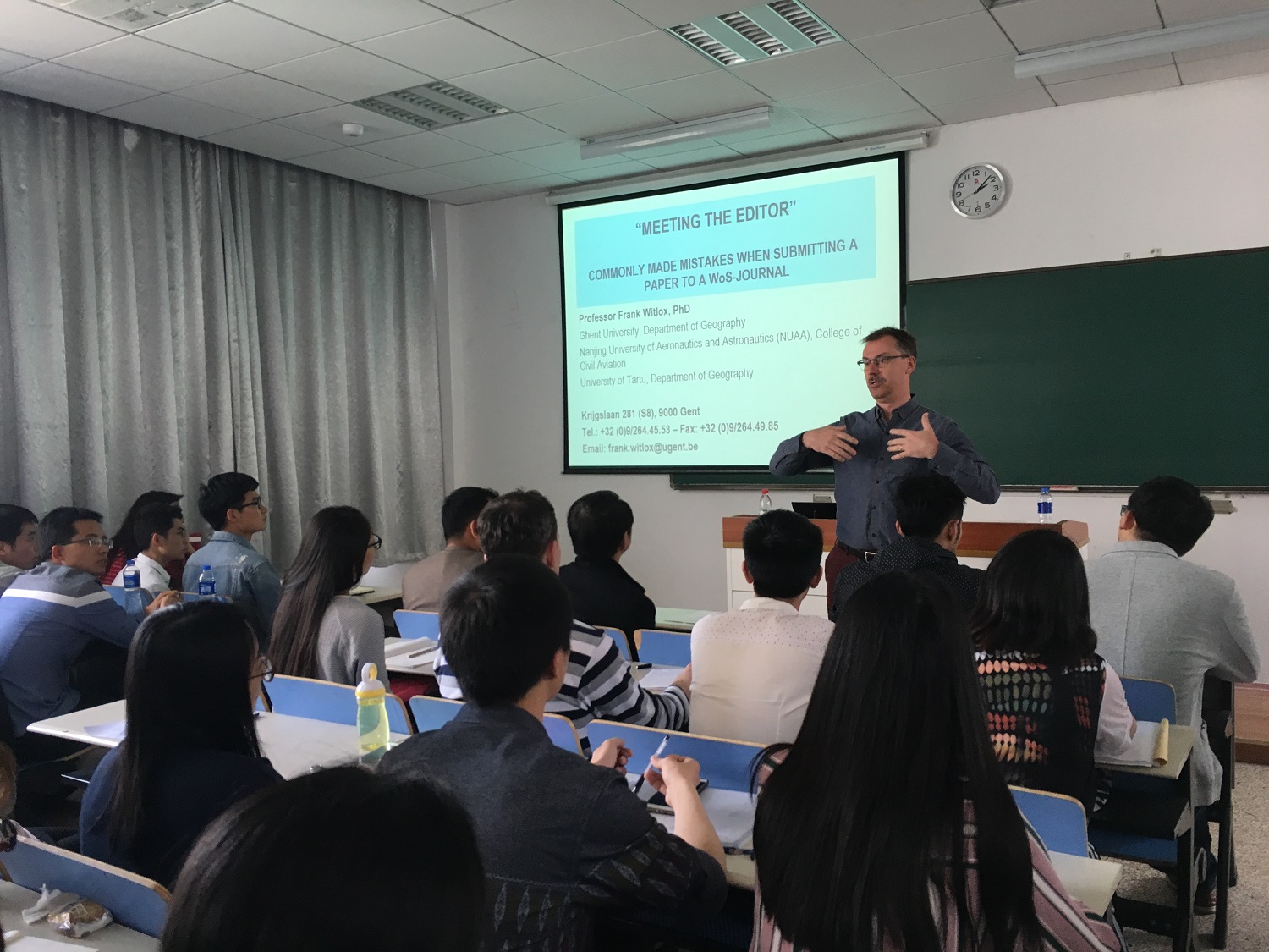 2017年4月17日下午2点,比利时根特大学Frank Witlox教授应成人动漫 邀请在将军路校区2号楼2105教室作了题为“英语学术论文写作:中国学者如何避免撰写及投稿误区”的学术讲座。讲座由副院长葛红娟教授主持。学院师生共计100余人参加了此次讲座。