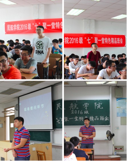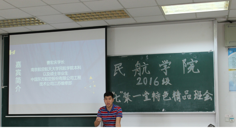 2017年6月7日下午2点,成人动漫 2016级机务工程专业的三个班级在6203教室联合召开了“七”聚一堂系列精品班会。出席此次班会的嘉宾有,民航工程系副主任丁萌老师,成人动漫 陆中老师,现任江苏东航机务的研究生毕业学长曹宏庆以及辅导员刘思辰。