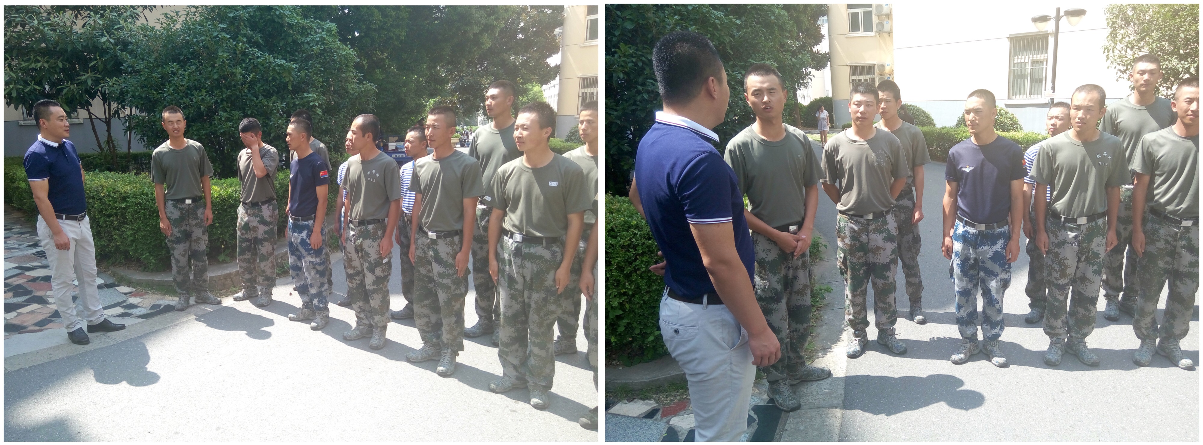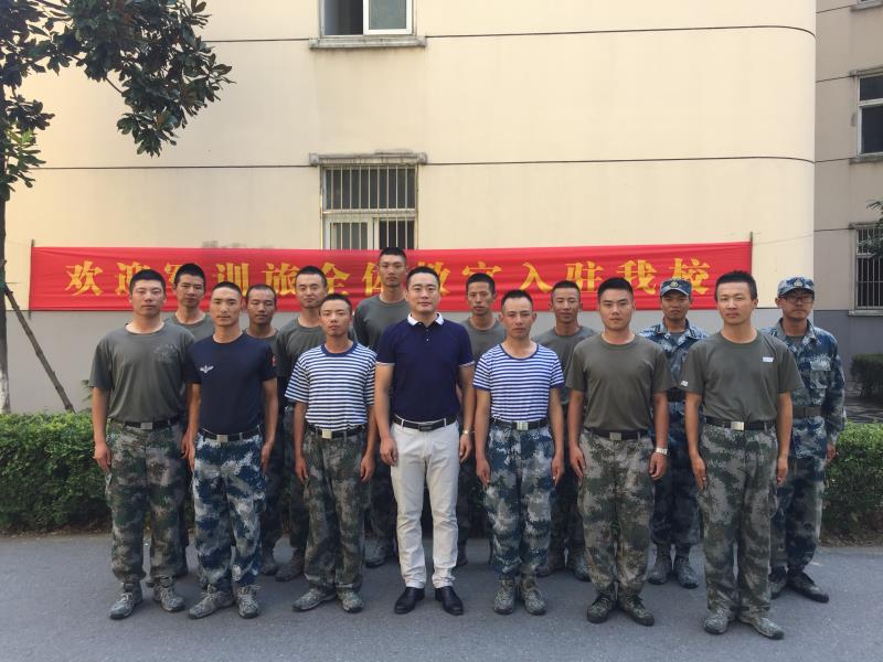一行人到达楼下,七营14名教官列队欢迎。首先李书记与各位教官亲切握手,代表学院领导和2017级新生对陆军工程大学的教官们的到来表示真挚的欢迎,并对参训教官数日来的刻苦训练表示衷心的感谢。随后,李书记就新生军训情况展开详细询问,例如军训科目设置、训练时间及整体安排等。谈话间,他希望参训教官能继续发扬艰苦奋斗的优秀品质和脚踏实地的优良作风,并将其传递给学生,让学生们更好地、高效地接受训练,顺利完成所有科目。同时,李书记代表学院会全力配合教官的训练工作,做好后勤。也祝愿全体参训教官能够在南航生活愉快,共度一段美丽的时光!最后,李书记和全体教官合影留念。