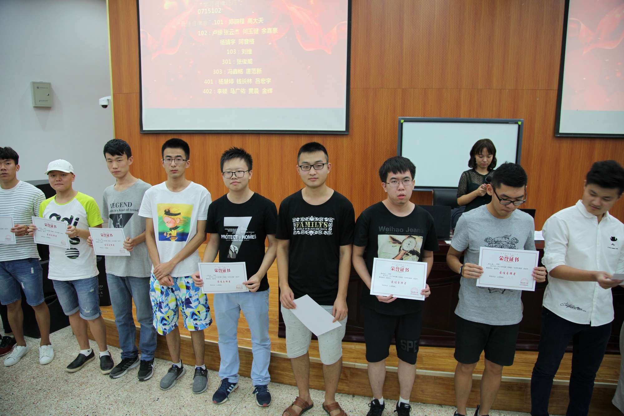 紧接着,张老师重点表扬了在上学期“15帮帮”活动中帮扶他人成效卓著的几位“帮帮先锋”并为他们颁发奖状。在这个帮扶活动中,有不少同学在帮扶后绩点显著提高,年级学风明显改善。张老师还表扬了在上学期“无手机课堂”活动中的“学习自律班级”和“最佳自律者”,并颁发奖状。在该活动中,不少同学坚持每次上课都上交手机,提高了听课效率。看到这么多同学受到表彰,其他同学深受鼓舞,相信在接下来的活动中,会有更多的同学参与其中。