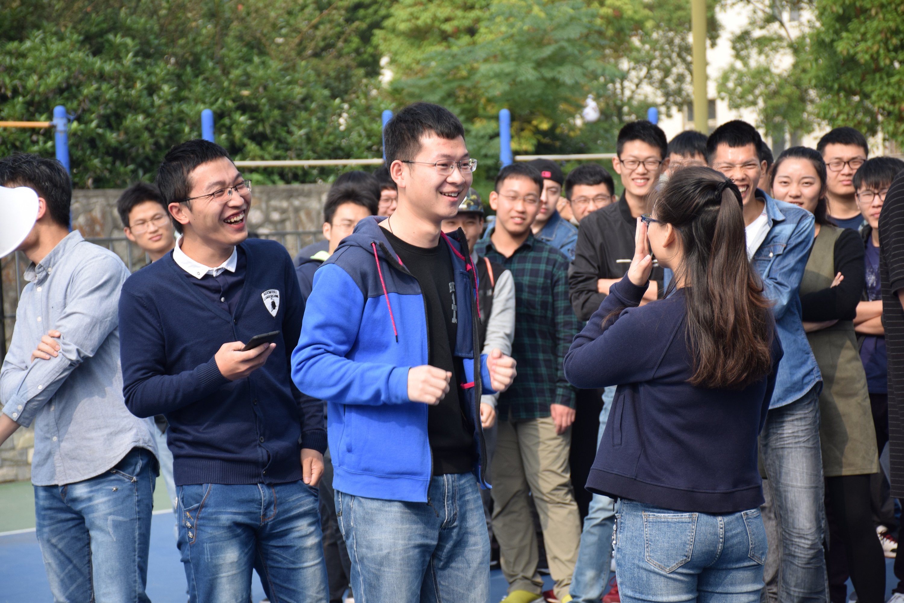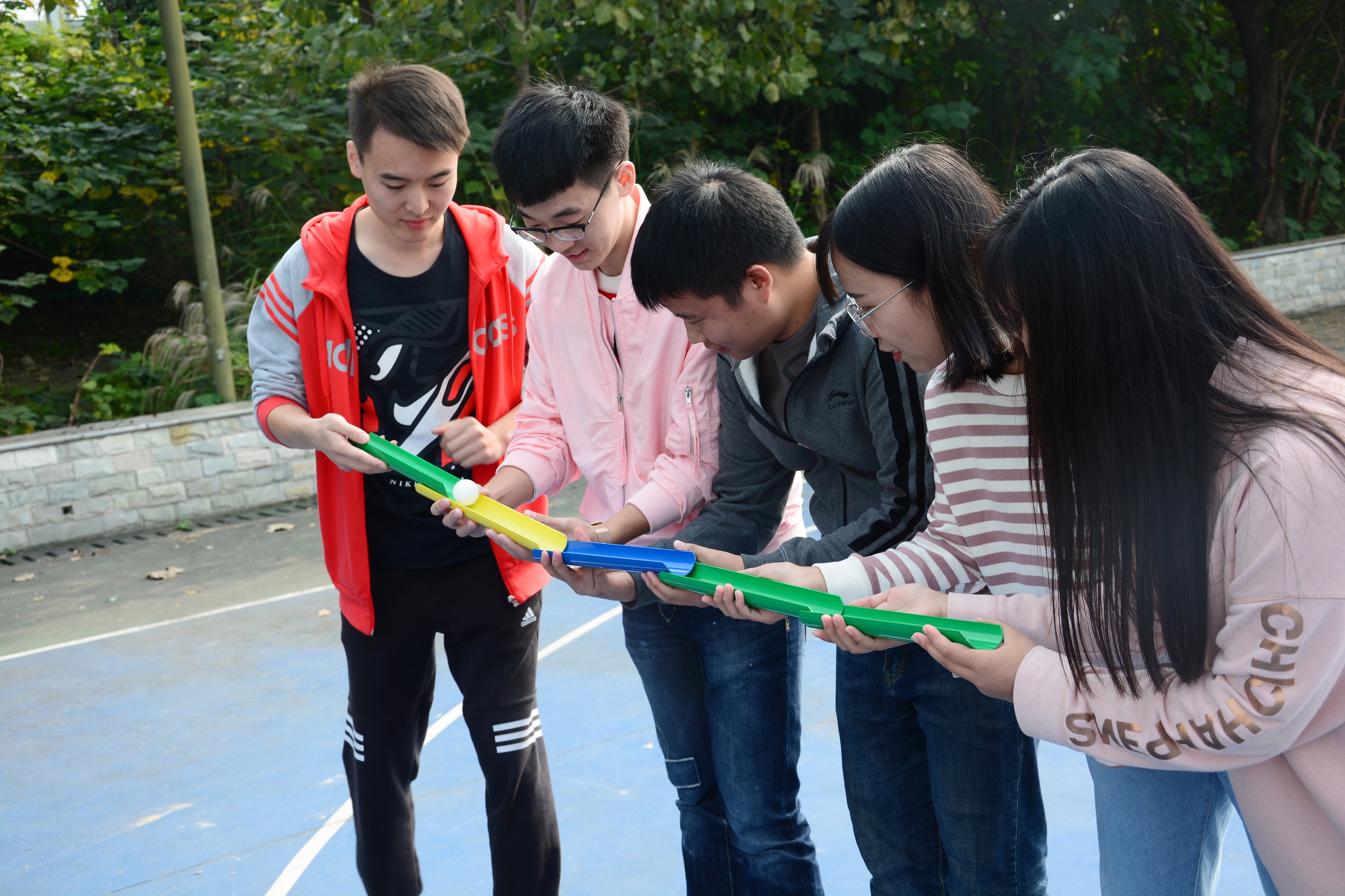 各个游戏中,对同学们的合作、想象能力要求最高的环节当属“你比我猜”这个游戏了。开展这个环节时,8个小组男女同学一齐上阵,站成一排,在要求无言语交流的情况下,通过自己的动作与神情将一个具体的词汇从队首传递至队尾。同学们天马行空的想象力和丰富多变的动作姿态赢得了其他同学们的欢声笑语,点燃了整个篮球场的气氛。除“你比我猜”之外,接下来的“传递乒乓”、“跳大绳”、“纸杯传水”、“怒吹乒乓”等丰富多彩的游戏环节同样吸引了同学们的注意,在场同学纷纷参与其中。