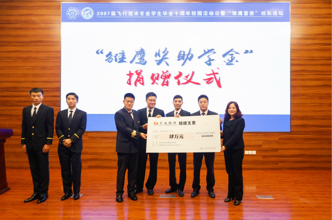 2017年11月2日,2007届飞行技术专业学生毕业十周年校园活动日暨“雏鹰蓄势”机长论坛启动仪式在南航大将军路校区隆重举行。50名机长们怀着激动的心情回到母校,重温校园生活,并捐助“雏鹰奖助学金”、受聘“机长班主任”,反哺母校。