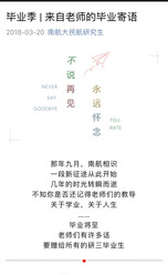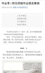 研究生三年的学习生涯中,每一步前行都离不开老师的引领与指导,每一份师生情都是最值得珍藏的记忆。毕业季,学院以师生情为主题开展了“毕业联播”系列活动,活动涵盖“来自老师的毕业寄语”、“毕业感言集锦”、“毕业祝福墙”三个子活动,通过语言文字、视频,记录毕业生们在成人动漫 三年研途生活的点滴过往。“来自老师的毕业寄语”活动,邀请各专业老师对即将毕业的2018届研究生们书写毕业寄语,劝勉毕业生在未来的人生道路上不畏失败、敢于拼搏。“毕业感言集锦”活动,通过手写明信片的形式,记录每一位毕业生三年民航生活的研途感悟和对南航校园生活的不舍,表达毕业生们与民航师生三年朝夕相伴的师生情,民航情;“毕业祝福墙”活动,邀请研一、研二的同学们将心中想对毕业师兄师姐说的话录制成视频,分享与师兄师姐朝夕相处的感动,送上最暖的祝福,并将视频拼接成一面“毕业祝福墙”,为即将离别南航生活的毕业生们送上最真挚的祝福。