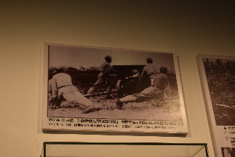 展厅右侧,陈列着当时士兵所使用的器物,中国军队佩戴的军帽、刺刀以及步枪。陈刚讲解员为积极分子讲述着1937年12.4至12.13那段腥风血雨的战争过程,面临着中日国力的巨大悬殊,面临着日军一次又一次的劝降,中国人民以炮火回击!用生命反抗!战场填满中国战士的尸体,阵亡率高达90%,但是,每在雨花台地区前进一寸,日军都要付出血的代价。南京保卫战的失败,使得南京城沦陷日军之手,但它在历史上确有着不可估量的重要地位,历史无言,精神不朽,它为日后的民族抗战精神添上了浓墨重彩的一笔。