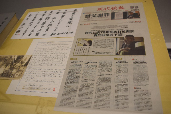 接着,我们来到了左侧展厅,左侧展厅陈列的是有关于南京大屠杀的藏品。率先进入我们眼帘的是两把交叉的日本武士刀,陈刚讲解员告诉我们,曾经有一个三年级的孩子在看到这件藏品时对他说:这是一把沾满了鲜血的刀。是啊,日本对中国进行惨无人道的大屠杀行为,是每个中国人都不应该忘记的历史,而日本政府对历史的歪曲否认中国更是不能接受。随后,陈刚老师向我们展示了著名的替父谢罪信以及当时人民日报的头条报道,日本友人西山诚一在2015年12月14日参观完南京民间抗日战争博物馆之后,交给了吴先斌馆长一封“道歉信”,替参加侵华战争的父亲向南京人民、向中国人民道歉。这一封道歉信具有重要的历史意义,它证明了南京大屠杀的真实性,也证明了有关南京大屠杀的怀疑是没有根据的。