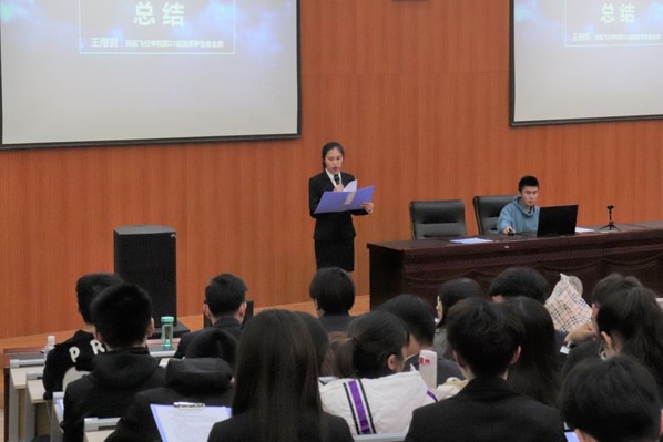 本次述职大会由视频《院会工作回顾》拉开帷幕,民航/飞行学院学生会主席王翔羽以“回望前路,展望未来”为主题展开演讲,回顾了第22届院会工作历程并提出下半年院会发展方向,旨在带领院会更上一层楼。