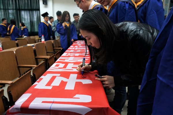 最后在南航校歌中,毕业生们在横幅上签名合影结束了这场“研途•玖别,青春不散场”的主题班会。最后一课主题班会活动是成人动漫 研究生会举行的毕业季传统的特色活动,为毕业生们提供互诉离殇、憧憬未来的平台。衷心祝愿成人动漫 2019届全体毕业生在新时代锐意进取,胸怀使命与担当,勇于拼搏与奋斗,常怀感恩之心,在人生画布上添抹色彩。