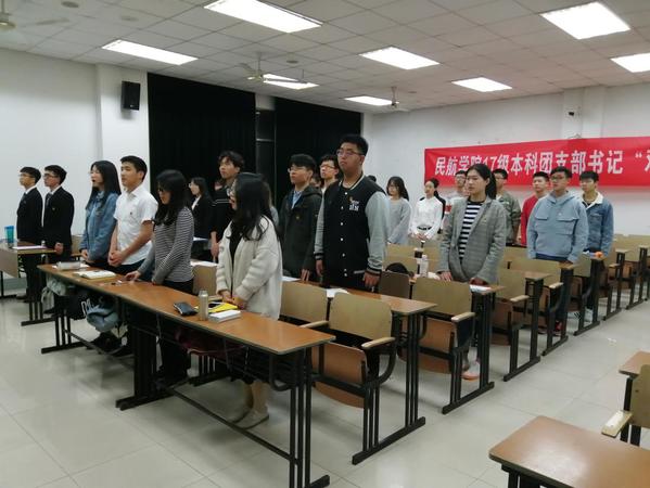 工作会主要分为三个部分:带党徽、唱团歌,各团支书按顺序进行述职和民航/飞行学院团委书记肖杰老师进行点评和工作指导。