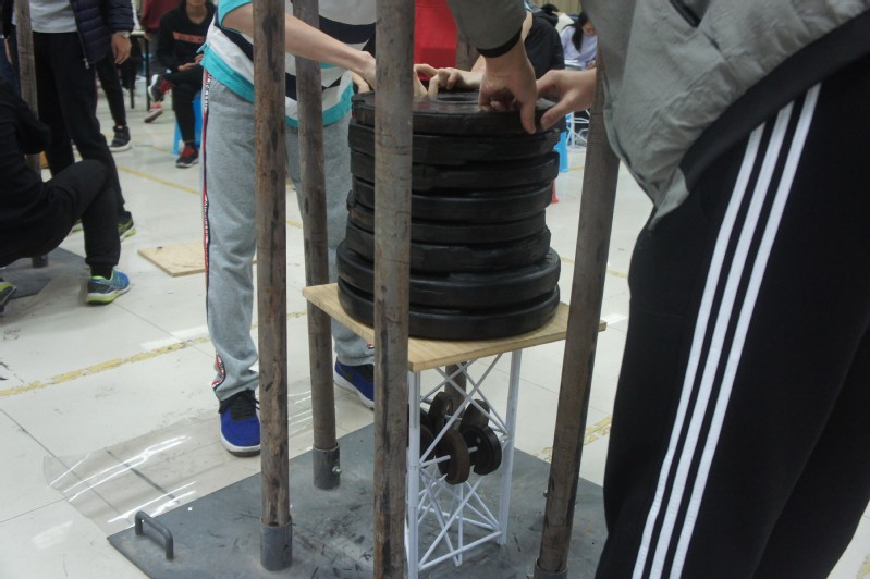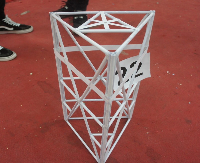 比赛当天,来自不同学院、不同年级的31支加载组队伍都信心满满地带着自己用A4纸精心制作的结构模型来到比赛现场等待加载,12组模型组精美制作的模型也已经陈列在舞台上等待检验了。在31组加载组队伍中,有一支是来自天目湖校区的同学。今年的加载组的赛题较去年有一些变化,由原来的三层结构变成了两层结构,并保持模型高度为500mm(±10mm),质量≤300g。最终,自重199.1g、高度500mm的模型以顶层承重201.65kg的成绩拿下比赛加载组的特等奖,结构能效比再创新高。
