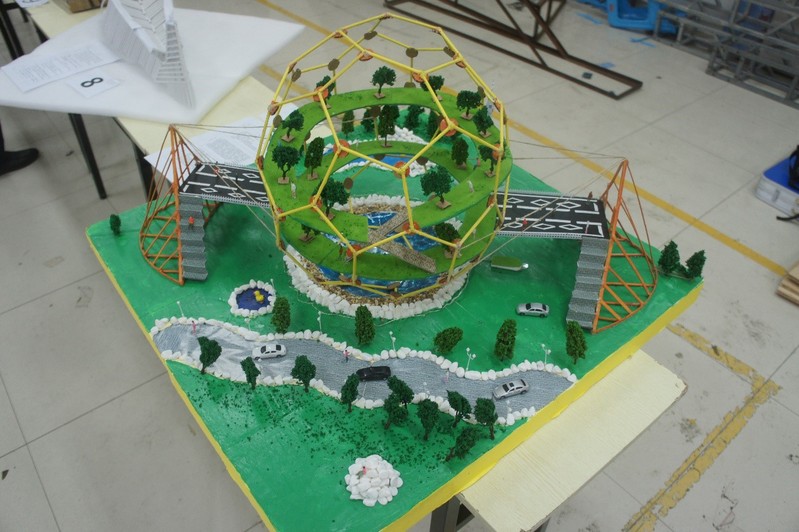 而不限材料的模型展示组中,同学们精心制作的作品也带来了惊喜,各种力学与美的结合巧妙得让人赞叹。其中,作品“城市绿色空间站”(上图),巧妙地将球形空间结构、索结构运用到了模型中,体现了独特的结构创新性,展现了一定的结构理念,取得了本次比赛的特等奖。