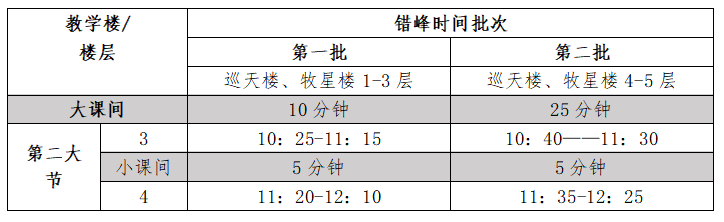 天目湖校区教学楼上午第34节课的上下课错峰时间仍按照原有方案执行,具体教学楼错峰上下课的时间安排见下表: