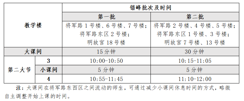 将军路校区、明故宫校区上午第34节课的上课时间调整为两批错峰:第一批大课间休息15分钟,第二批大课间休息30分钟;小课间均休息5分钟。具体教学楼错峰上下课的时间安排见下表: