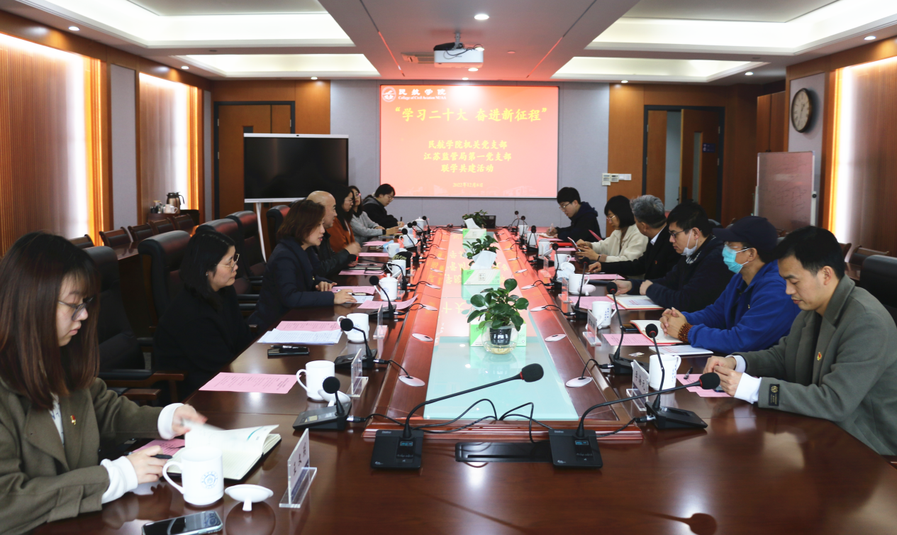 为进一步推动学习贯彻党的二十大精神走深走实,加强学院和民航江苏监管局交流合作,12月8日下午,成人动漫 机关党支部与民航江苏监管局第一党支部开展“学习二十大·奋进新征程”联学共建活动。民航江苏监管局航务处处长、支部书记郭久宏,成人动漫 党委书记刘建成、党委副书记王艳及双方支部党员代表参加活动。活动座谈会由成人动漫 机关党支部书记鲁悦主持。