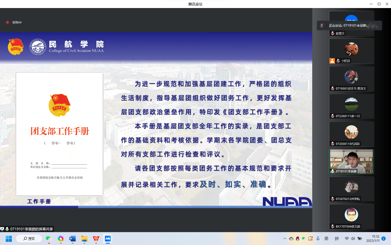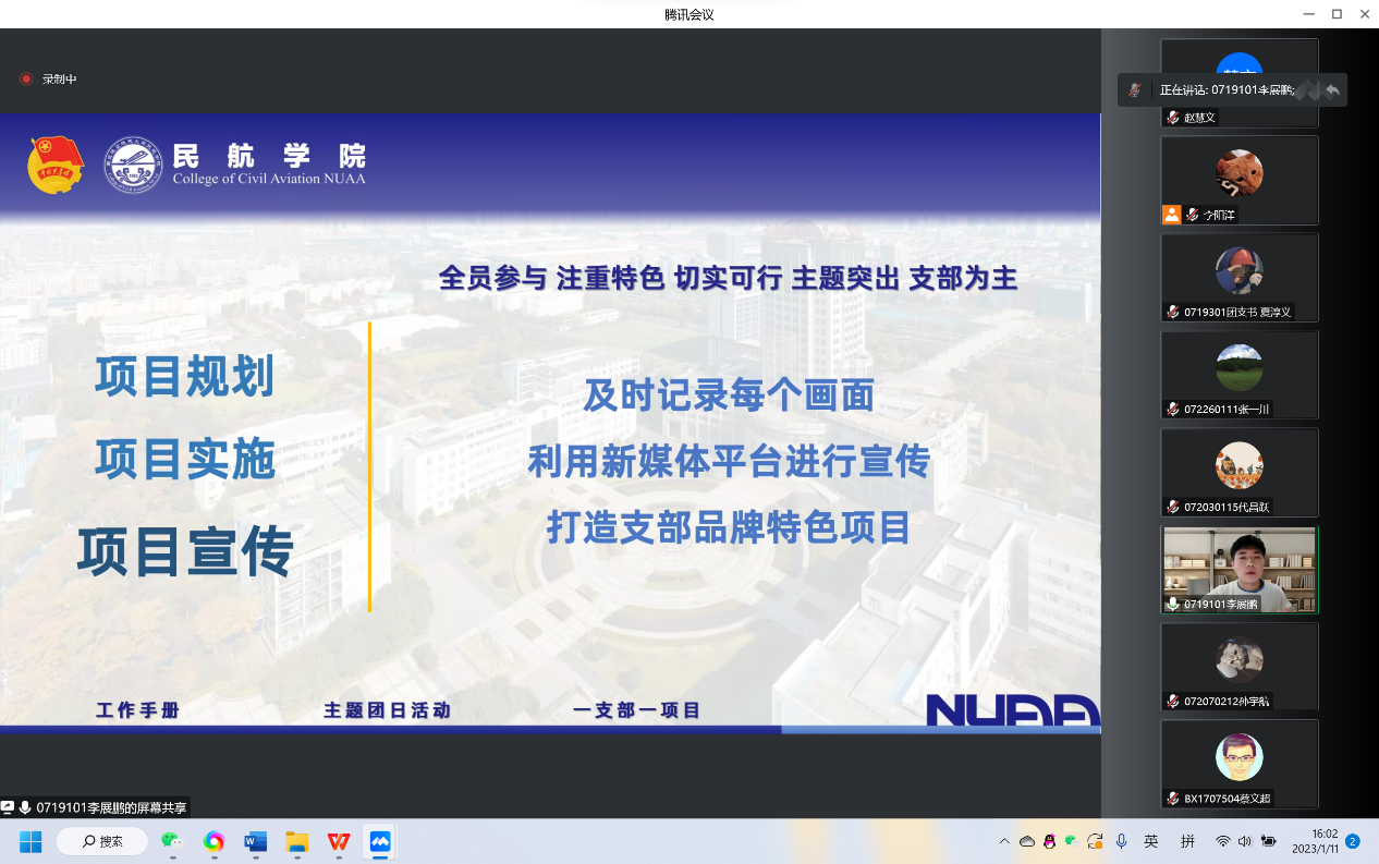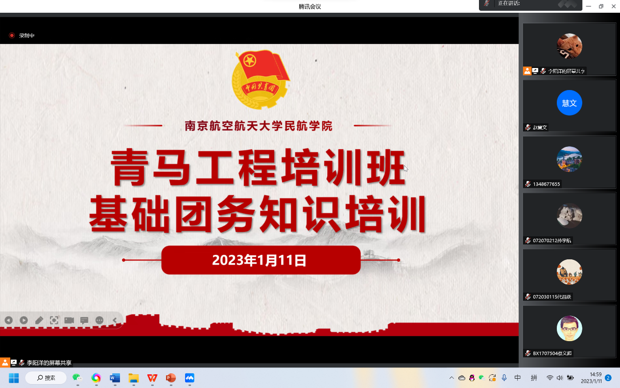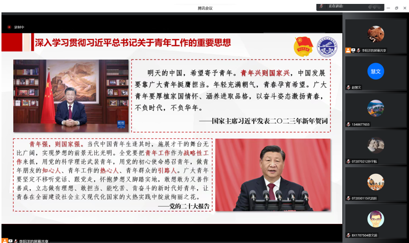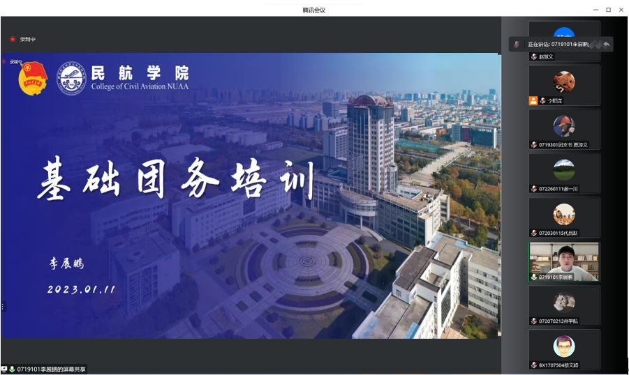 为提高基层团学组织骨干的理论基础和业务水平,进一步加强青年的思想政治引领,2023年1月11日下午,成人动漫 于线上开展青马工程培训班之基础团务知识培训。成人动漫 团委书记赵慧文、19级本科生优秀团干李展鹏、成人动漫 团委副书记李阳洋和全院团支书、团总支参与此次培训。